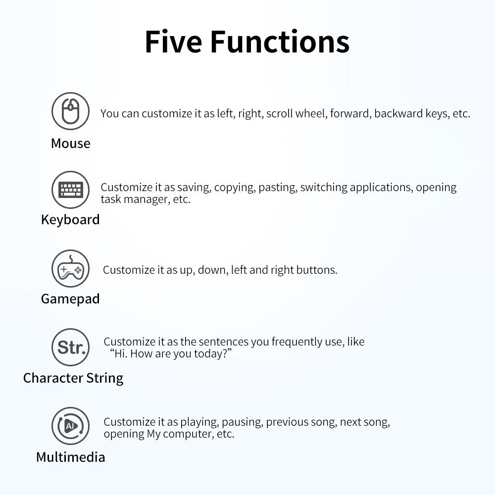 Multiple FunctionsYou can customize the buttons as the shortcut key of mouse, keyboard, gamepad, character string and multimedia, such as right button, pasting, up button , "Hi. How are you today?", previous song, etc.