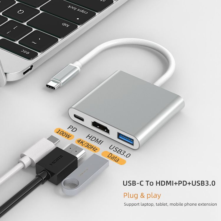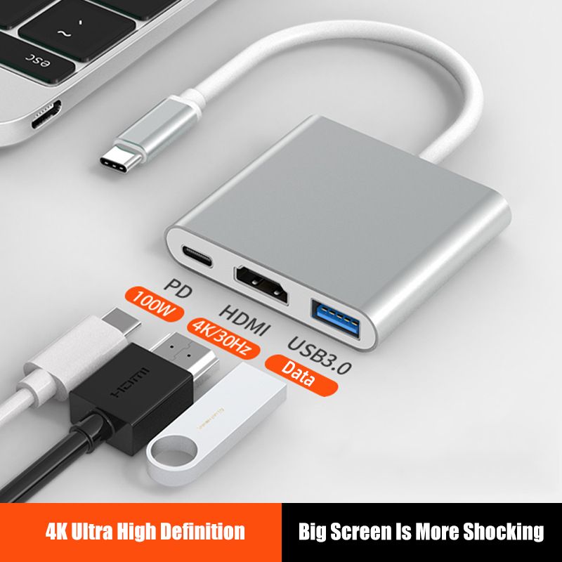 About this item:USB C 3-in-1 Adapter - Expands computer ports into an HDMI 4K output port, a USB 3.0 port, and a USB-C charging port. Three ports can work at the same time. Lightweight, plug and play, no extra driver needed. The slim and portable design with an aluminum body provides better heat dissipation.4K UHD HDMI PORT - The USB C to HDMI adapter supports mirroring or extending your phone/laptop display to a TV, projector or monitor. Resolutions up to 4K UHD (3840x2160@30Hz). Help you enjoy nice pictures in movies and work.Fast Transfer & PD Charging - USB 3.0 Supports 5Gb/s(5120Mbps) Movies or Data Transfer, USB Port available to connect USB Driver, wireless mouse, and Wireless Keyboard. With a 100W fast-charging USB C port, you can charge your device quickly.Broad Compatible - USB C HDMI adapter compatible with 2015/16/17/18/19/20/21 MacBook/MacBook Pro, Macbook air2021/2020/2019/2018, imac2020, Samsung Galaxy S20/S10/S9/S8 Note10/9/8, Surface Book 2, Dell XPS13/15, Acer Spin7, Acer Chromebook R13, Yoga 900/910, Google Chromebook Pixel, HP Spectre X2/X360/ etc.Compact design - This multiport HDMI adapter is a compact design that you can carry easily.