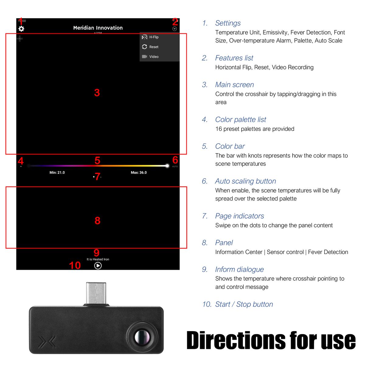 Recording: User can record the video that takes the main screen streaming from the app by clicking Video button. Recorded video will be saved in default DCIM/MeridianInnovation folder that should be able to show in system albums after stop recording.