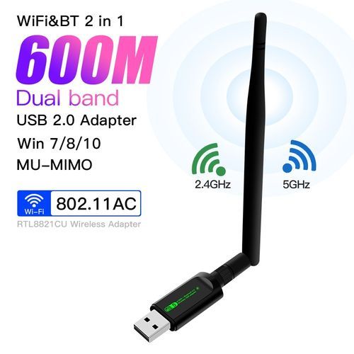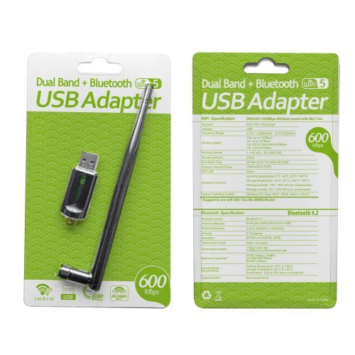 Specification -Item Name: Dual-Band WiFi Bluetooth Adapter -Bluetooth version: 4.2 -Chipset: RTL8821CU -Interface Type: USB 2 .0 -Frequency range: 2.4GHz+5.8GHz -Antenna gain: 5 dBi -Transmiion Rate: 600Mbps (11N:150Mbps, 11AC:433Mbps) -Standards: IEEE 802.11AC, 802.11b, 802.11g, 802.11n -Size: 53x 19x10 mm -Color: Black -Encryption: WEP Encryption, WPA-PSK, WPA2-PSK, WPA/WPA2 64/128bit Encryption. Package Included 1 x USB WiFi Bluetooth Adapter