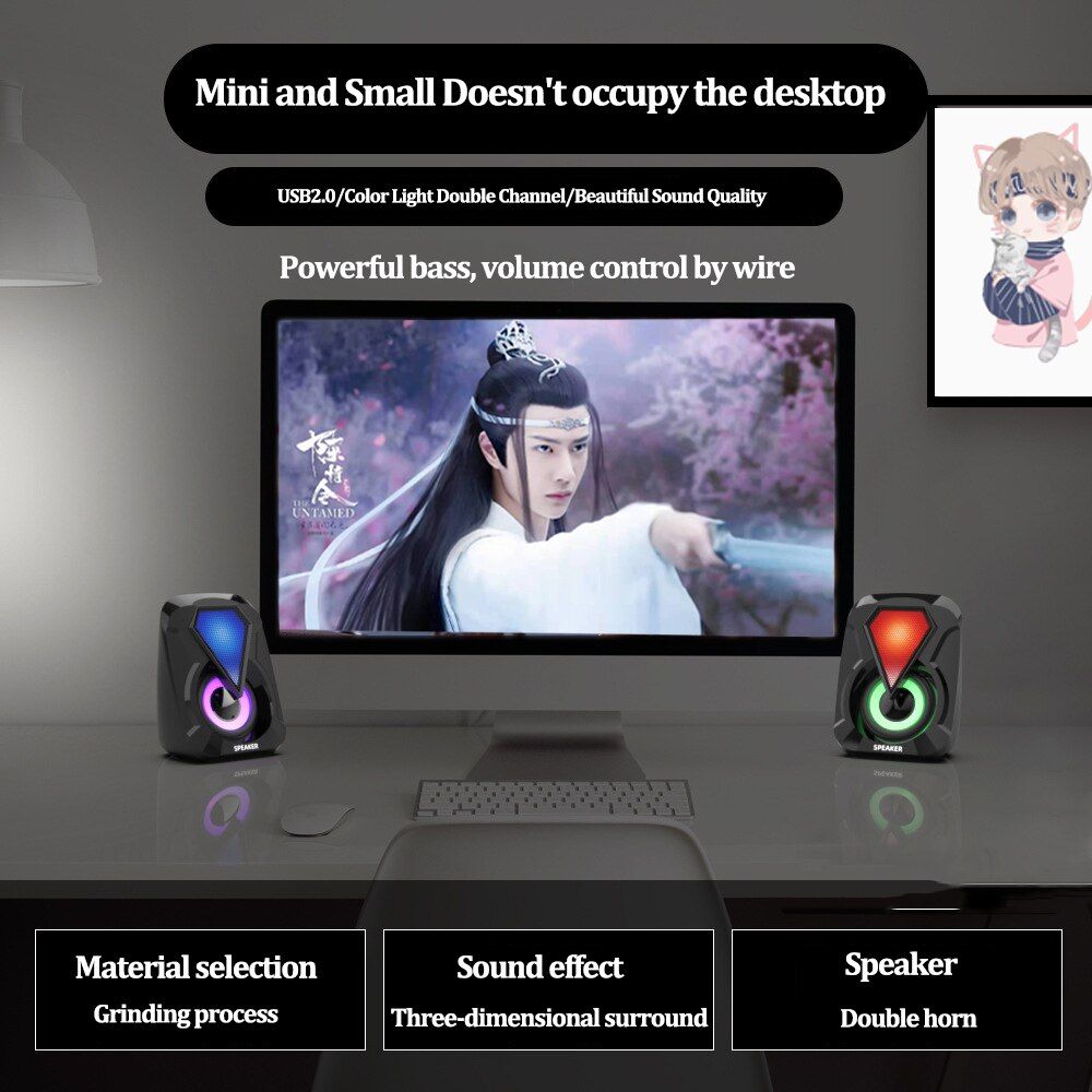 Colorful LED Light, with colorful breathing light, it will bring you both visual and aural enjoyment USB supply power directly, easy connection Large diameter full frequency vibration loudspeaker, deep ba, rich mid-range and clear treble Rear ba trumpet, ba thick, to bring you high-quality ba High magnetic speaker, give you a different listening experience Can connect PC, laptop, mobile phone, MP3, MP4, DVD