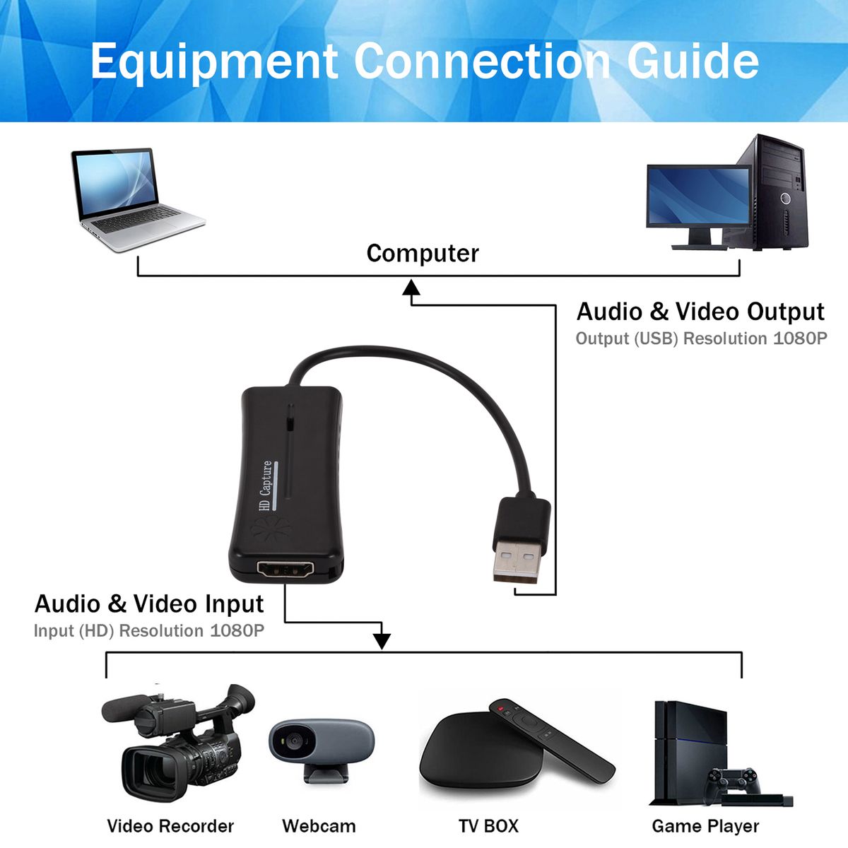 Supports maximum input resolution and output resolution up to 1080P. Comes with USB cable, which can be directly connected to the computer.