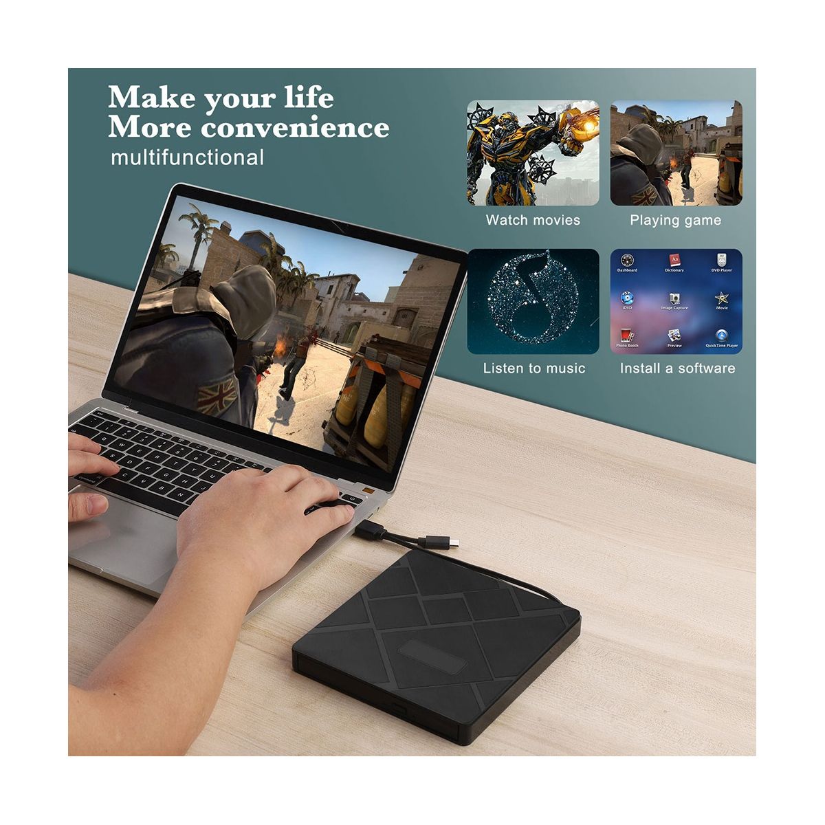 and Non- Design: design and the embedded, integrated cable allow to be stowed in a pocket or drawer. The housing of the DVD drive has 4 small , which reduce vibrations and prevent slipping on surfaces.