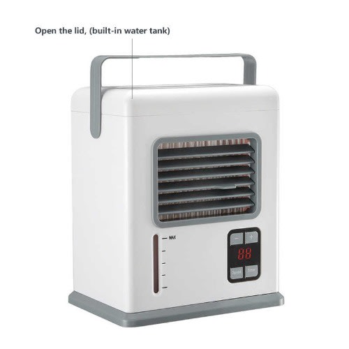 To begin using this small air conditioning unit, after making sure it's sitting securely on a flat surface, you'll need to take off its lid and pour water into the designated hole. For this task, don't use water that's extremely hot or cold.