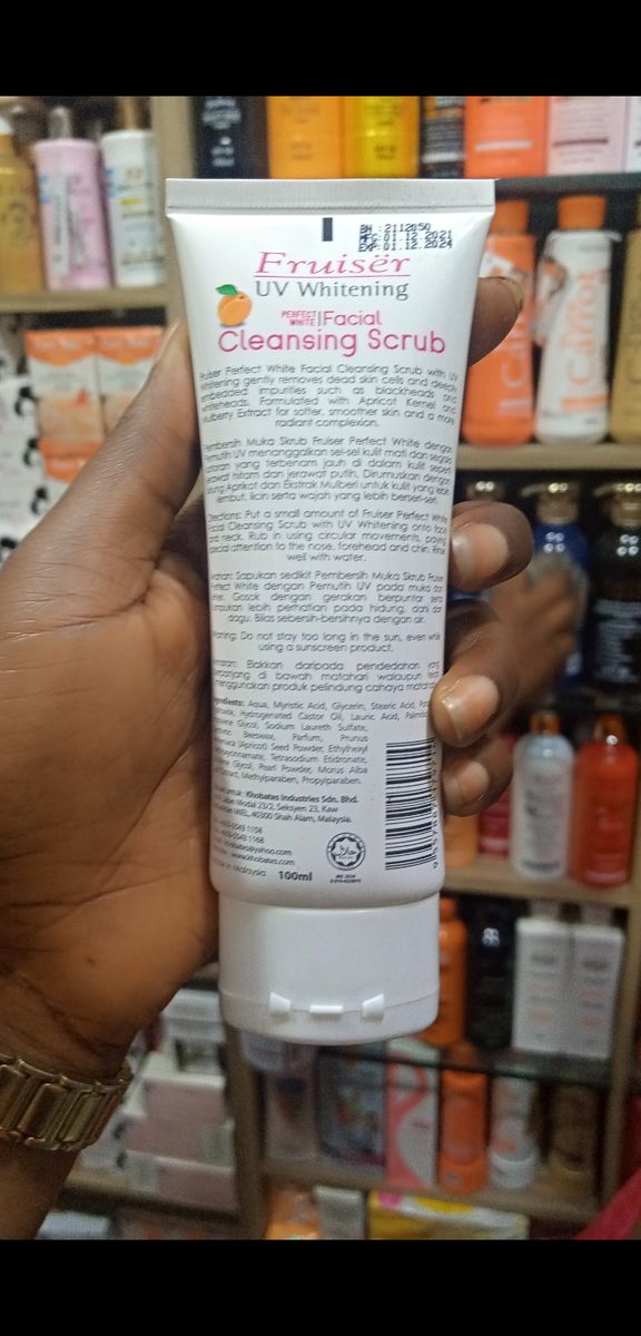 Fruiser perfect white facial cleansing scrub with uv whiten gently removes dirty and ied sin cell and deeply embedded , it improvesand impurties such as blackhead and whiteheads,formulated with apricot kernel and mulbery extract and soofter,smoothes skin and more with a omplete result of radiant complexion.