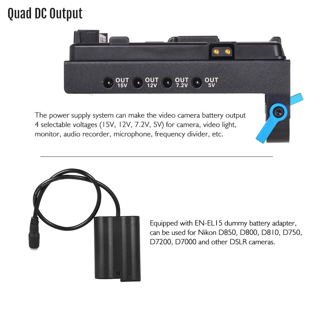 Quad DC output: The supply system can make the video camera battery output 4 selectable voltages (15V, 12V, 7.2V, 5V) for camera, video light, monitor, audio recorder, microphone, frequency divider, etc.
