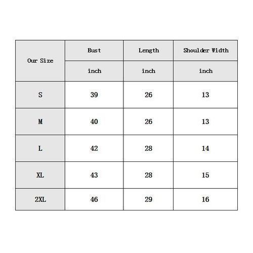 | Our Size | Fit US Size | Chest (cm) | Length (cm) | Shoulder Width (cm) |
