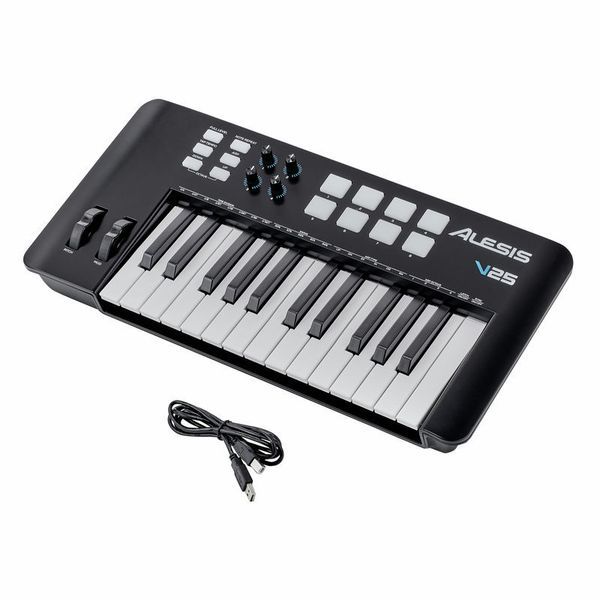 V25 25-Key USB MIDI Keyboard Controller from Alesis provides hands-on control of a variety of music software. Its 8 backlit pads can be used for drum programming as well as launching clips, while 4 assignable knobs and 4 assignable buttons can provide control over a wide variety of MIDI-controllable software parameters. A USB cable and downloads for Ableton Live Lite and Xpand! are included.