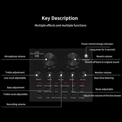 12 kinds of electric sound, 8 kinds of sound effects, 6 kinds of effect modes.2. Reverberation size adjustment, microphone volume adjustment, high bass adjustment, recording volume control, music volume control, monitoring volume control (earphone function).