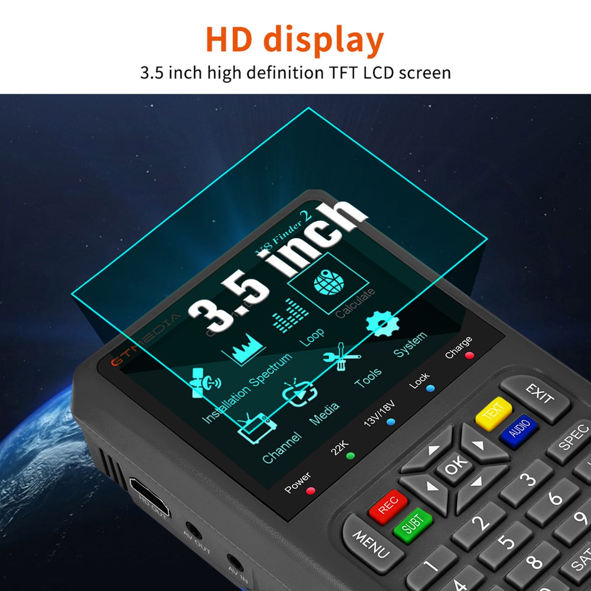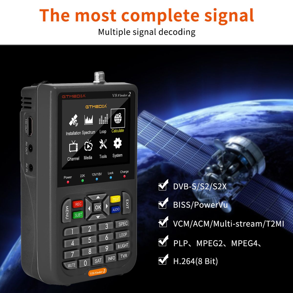Overview: GTMEDIA V8 Finder 2 is a D V B-S/S2/S2X and MPEG-2/4 H.264 (8 Bit) compliant handheld signal finder meter. With its compact size, light weight, intuitive user's interface, long battery operational hours and rich feature set, the meter provides all functions needed for installation and verification of digital TV service to residential homes or multi-dwelling units.