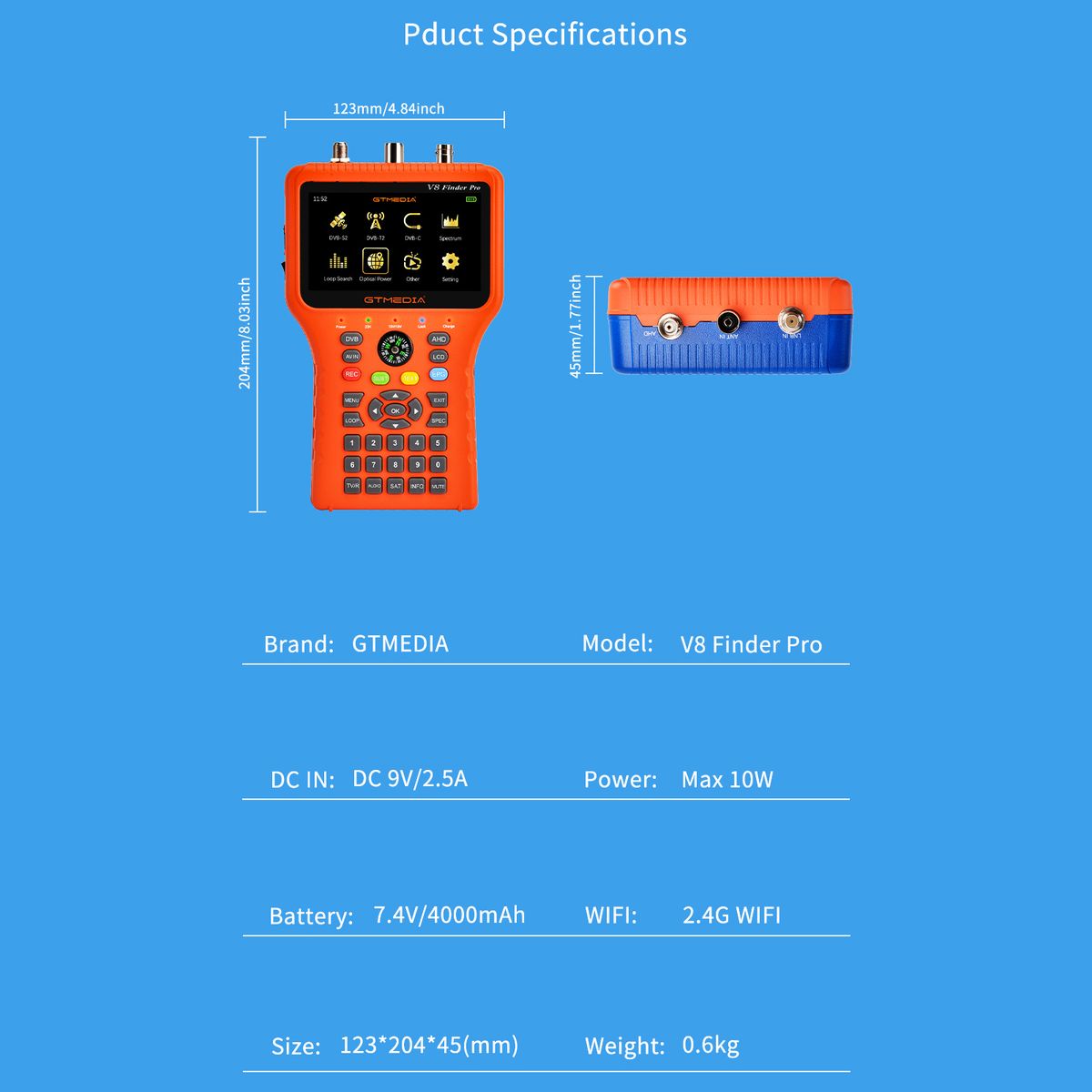 Overview: GTMEDIA V8 Finder Pro is a D V B-S2X/S2/S/T2/T/C/ATSC-C and MPEG-2/4 H.264/H.265 (10 bit) compliant handheld combo meter. With its compact size, lightweight design, intuitive user's interface, long battery operational hours and rich feature set, the signal finder meter provides all functions needed for installation and verification of digital TV service, antenna signal and cable signal to residential homes or multi-dwelling units.