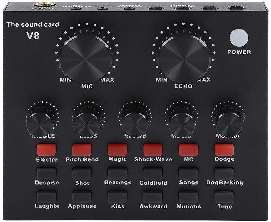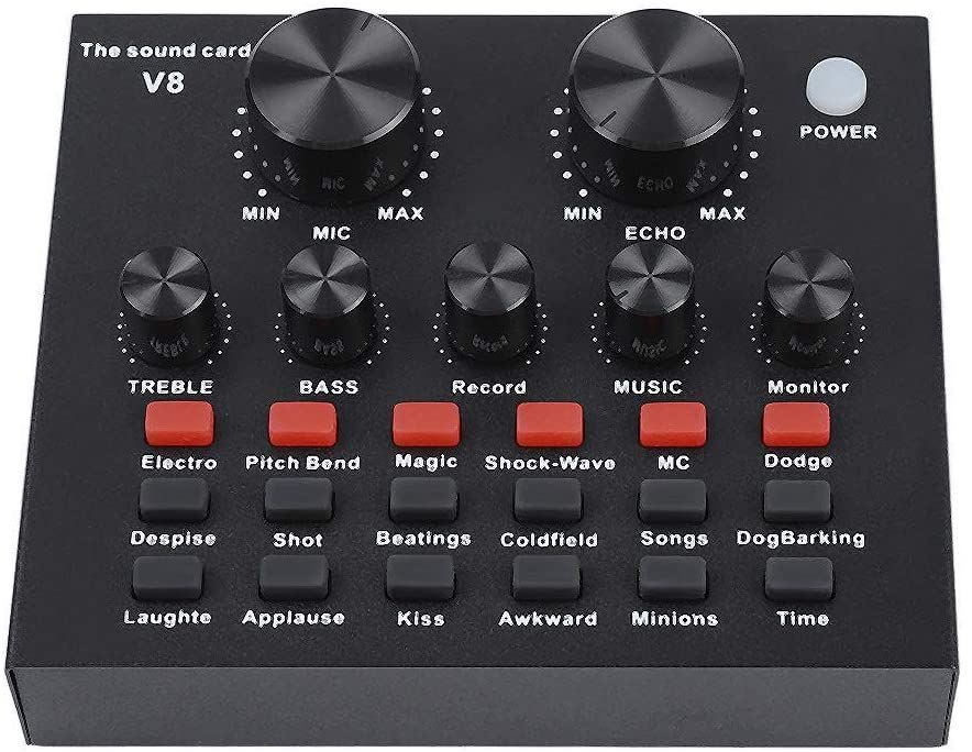 Reverb, treble, bass, recording, music, monitor, microphone adjustmentSound card V8 voice converter provides these knobs, you can adjust and use these functions according to your preferences