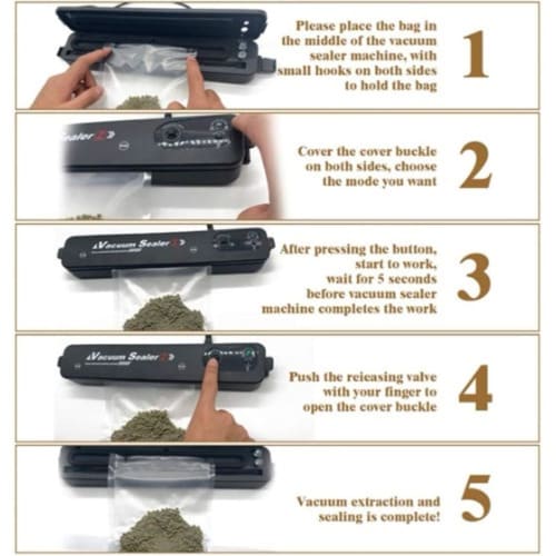 How To Use The Vacuum Sealer And Seal With Bags:1. Put the items inside the bag. Clean and straighten the open end of the bag, clearing away any dust and smoothing out wrinkles or ripples.2. Place the open end of the bag in the vacuum chamber beneath the air intake. Do not overfill the bag.3. Close the lid and then press on both sides of the lid, and lock the buckles.4. Press the "Vacuum & Seal" Button and the green LED will blink, the bag will be automatically vacuumed.5. When the LED turns to be red, the bag will be automatically sealed.6. When the LED turns to be green again, the process is completed.7. Open the vacuum releasing valve and release the vacuum pressure inside the machine.