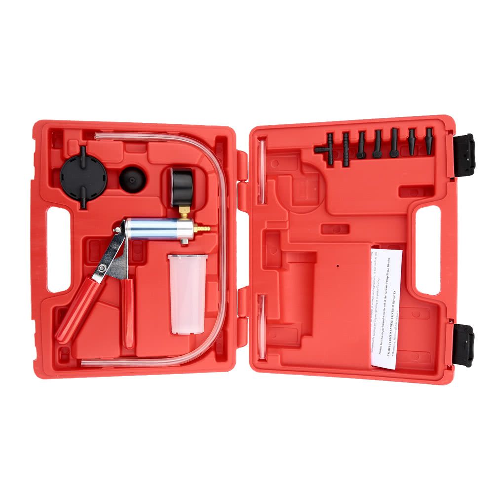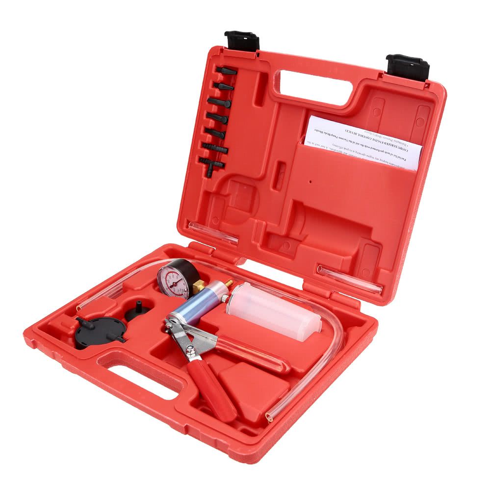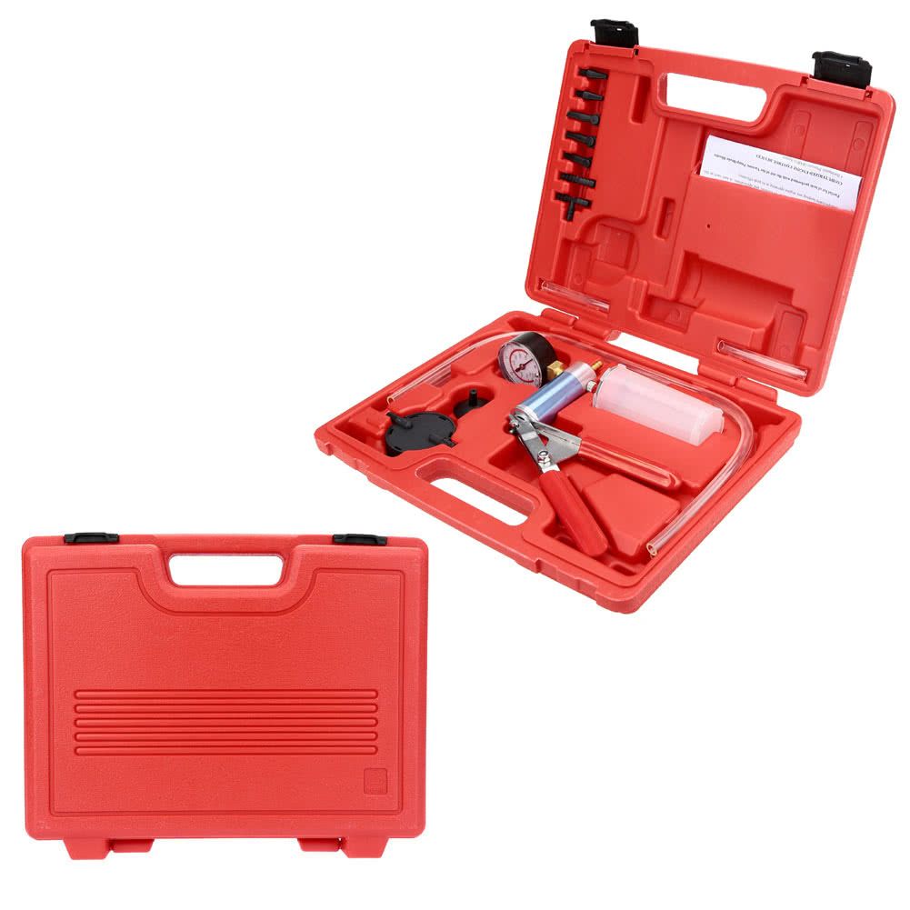 The vacuum pump is used to test a variety of essential vehicle settings and operations. It can check vacuum and pressure operated automotive components. It includes a brake fluid reservoir for bleeding operations.