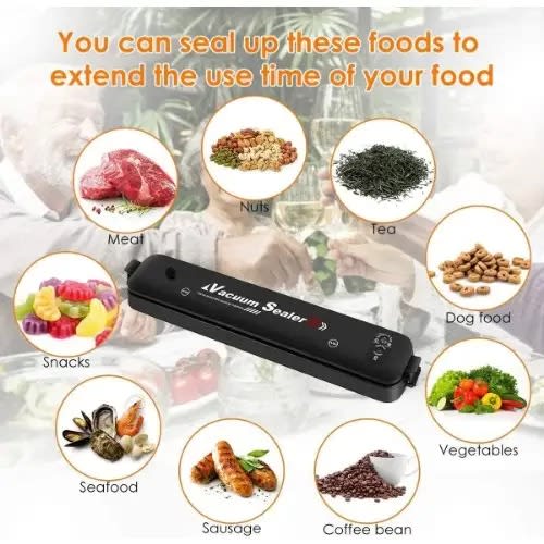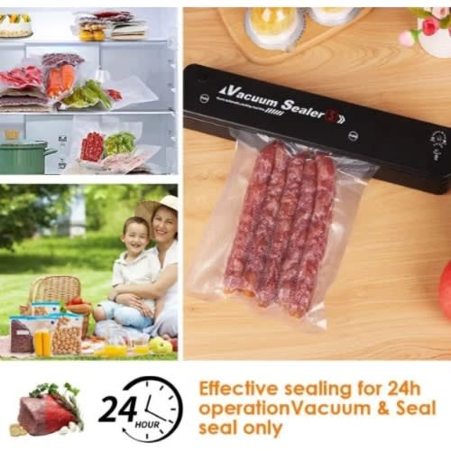 Features:Economical and Practical:Vacuum Food Sealer eliminates freezer burn, reduces spoilage and food waste, and effectively increases food shelf life, making food still fresh and flavorful.Good Healper for Cooking:Cooking and meal preparation becomes easier. Using Sous-Vide cooking method to acheive excellent results when preparing food. It also saves space of your freezer with the airtight bag packaging.Easy to Operate:Do vacuum packing and sealing with one simple press, sealing food in seconds, offering you a quick, easy and inexpensive way of preserving your food.Compact & Slim Design:Compact size and lightweight design for easy store. It can be placed on any kitchen counter top. Be careful with the heated sealing edge, not recommended for children to use.Requirements on Film / Bags:The Vacuum Sealer fits up to 27cm width vacuum sealer bags and rolls with dots, knobs or grooves on one side and can preserve all types of food.Note:1. When placing the bag in the vacuum sealer, the end of the film must be positioned in front of the rear limitation webs and the lateral limitation webs (just inside the bottom sealing ring).2. Please keep children and animals away from the electric device at all time.3. The welding wire becomes very hot during operation. Do not touch it.Specifications:Two Modes: Seal Only, Vacuum & SealSealing Width: 27cmVacuum Degree: -60KpaRated Voltage Power Supply: AC 100V-240V 50/60HzPower: 90WColor: BlackItem Size: 36.8 * 7.7 * 7.5cm / 14.48 * 3.03 * 2.95inItem Weight: 420g / 14.80ozPackage Size: 37.3 * 9.9 * 8.1cm / 14.68 * 3.89 * 3.18in