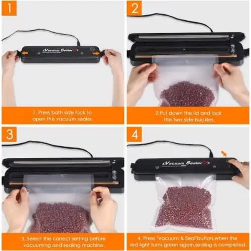 How To Use The Vacuum Sealer And Seal With Bags:1. Put the items inside the bag. Clean and straighten the open end of the bag, clearing away any dust and smoothing out wrinkles or ripples.2. Place the open end of the bag in the vacuum chamber beneath the air intake. Do not overfill the bag.3. Close the lid and then press on both sides of the lid, and lock the buckles.4. Press the "Vacuum & Seal" Button and the green LED will blink, the bag will be automatically vacuumed.5. When the LED turns to be red, the bag will be automatically sealed.6. When the LED turns to be green again, the process is completed.7. Open the vacuum releasing valve and release the vacuum pressure inside the machine.