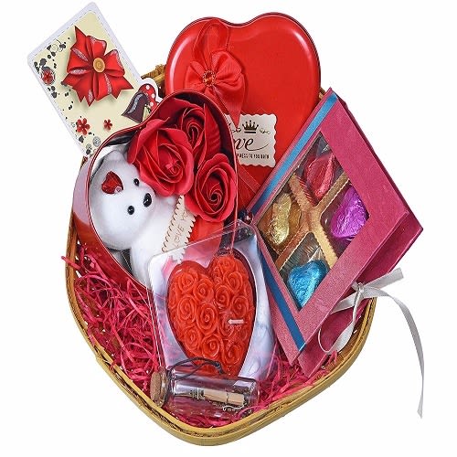 EVYSWORLD Charming Valentines Day Gift for Girlfriend/Boyfriend/Husband/Wife/Fiance-Beautiful Basket+Chocolates in a Decorated Box+3pc Roses and Teddy Bear in Heart Box+Heart Shaped Cented Candle+Card