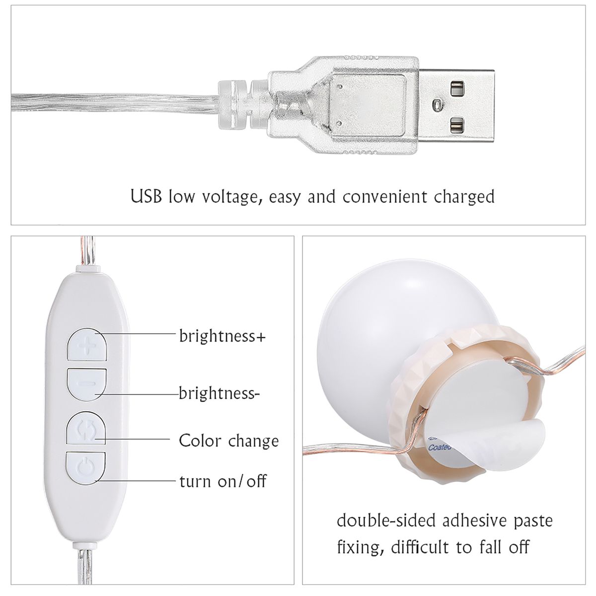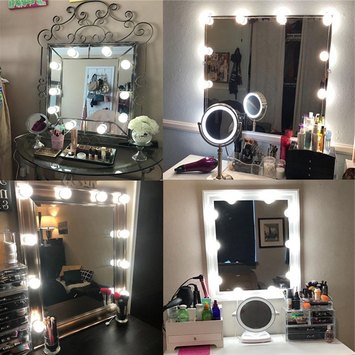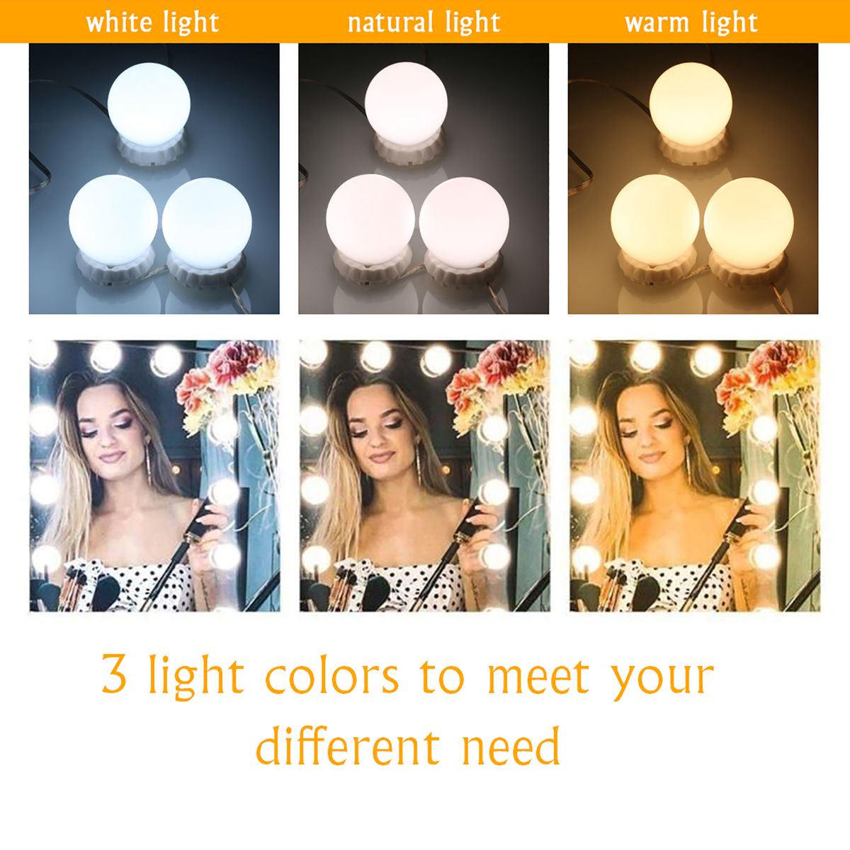 10 LEDs vanity mirror light bulbs with 3 lighting modes and 10 brightness colors, allowing you to make-up for a long time without hurting or posing problems for your eyes.