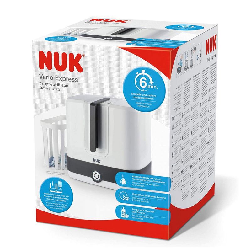 Hygiene takes the highest priority in a household with children, especially in the first months of life as the immune system of newborns is not yet fully developed. With the NUK Vario Express you can be sure that bacteria are reliably removed from bottles, soothers and accessories. However, the steam steriliser not only ensures thorough sterilisation - it also makes the work in everyday family life considerably easier.