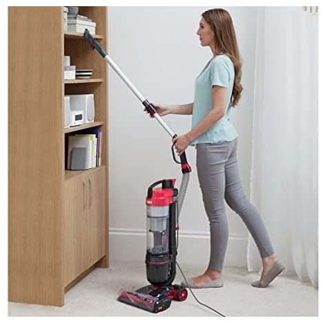 From the manufacturerAccelerate your cleaningVelocity Evo excels in every department, achieving the best possible & lsquo;A & rsquo; ratings for dust pickup on hard floors and carpets, as well as an A+ for energy efficiency. With A class emissions and HEPA filtration, less than 0.03% of dust is emitted back into your home, making it a good choice for allergy sufferers.Velocity Evo has been designed for smooth manoeuvrability, allowing you to easily steer around your furniture. You can instantly switch from cleaning carpets to vacuuming hard floors such as kitchen tiles, thanks to the on/off rotating brush bar, operated by a button near the handle.Featuring advanced multi-cyclonic dust separation technology, Velocity Evo allows you to clean for longer before needing to stop and wash the filters.Our innovative Intellicare sensor detects when you are stationary and stops the brush bar from rotating in order to protect your carpets. When you start moving again, the brush bar restarts automatically.The VE01 model is great for small and medium sized homes, with a 6m cord and 2.5m stretch hose. If you are looking for longer reach, why not consider upgrading to the VE02 which has a 12m cord and 4.5m hose.A selection of tools are supplied to help you tackle vacuuming tasks all over the home. These include a crevice tool and dusting brush for vacuuming a range of surfaces, as well as a long extension tube.Also included is a powerful pets turbo brush to effectively loosen and lift stubborn pet hair, leaving your stairs, carpets and upholstery beautifully clean and hair-free. Main featuresA+AAA rated vacuumThe Velocity Evo bagless upright uses less energy, with an excellent A+ rating for energy efficiency. It also achieves the highest possible 'A' ratings for dust pickup in lab tests on hard floors and carpets, along with an 'A' for low emissions.Multi-cyclonic technologyVelocity Evo uses advanced multi-cyclonic dust separation technology to separate dust from the air, helping the filters to stay clean for longer.Intellicare technologyThis clever feature helps to protect your carpets by decreasing the power & the speed of the brush bar when you stop moving. When the vacuum cleaner is moved or the hose is used, it automatically reverts back to full power.Pets brushThis pets upright comes with a mini turbo brush to help remove stubborn pet hairs from cushions, sofas and carpets. The rotating bristles penetrate deeply into the fabric to loosen the fur and vacuum it into the dust collection chamber. Main featuresUltra manoeuvrableUnlike traditional style upright vacuums which only allow you to move backwards and forwards, Velocity Evo has a swivelling, low profile floor nozzle. This allows you to glide around and under furniture smoothly.On/off brush barIf you have both hard floors and carpets then you need your vacuum to be adaptable, and to clean all of the surfaces in your home effectively. Switch the brush bar on when cleaning carpets, so that it will agitate the fibres, enabling you to clean deeply. With the brush bar switched off, you can glide smoothly on hard floors, leaving any delicate surfaces scratch free.Tools on boardVelocity Evo features a 2.5m stretch hose, removable handle, extension tube, long crevice tool and a 2-in-1 upholstery tool/ dusting brush that will help you to clean all over your home. The tools are stored on the vacuum cleaner, so they are always to hand when you want to use them.Easy empty bin