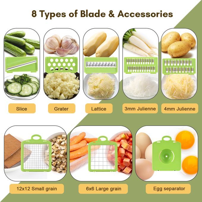 【8IN1 Kitchen Tool】 Vegetable Composite Choppers contains 8 different sizes of fruit chopper blades interchangeable blades for thick/thin slicing, dicing or chunking, shredding thick or thin, grinding and chopping. Also have an egg white and yolk separator.