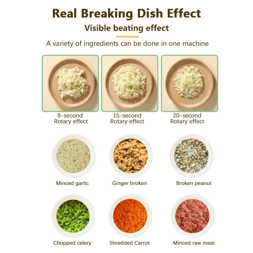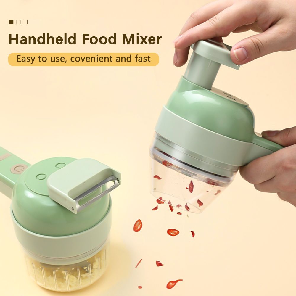 - 4 in 1 Function:Handheld electric food chopper has 4-in-1 functions: slicing/ crushing/ peeling/ cleaning brush. Easily prepare various ingredients to cook for saving time and effort.