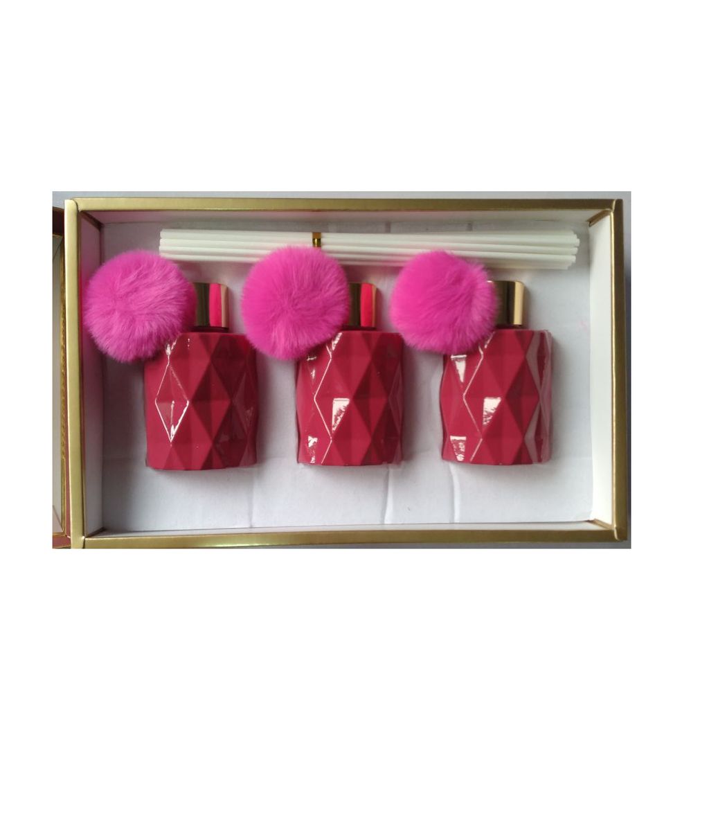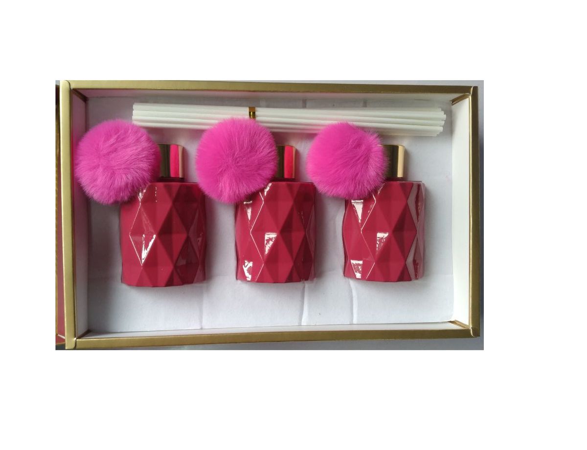 This home fragrance set is sure to provide a delightful scent within any home space. It is packaged as a set of 3 diffusers each one with a fuchsia pink pompom - in a sleek gift box
