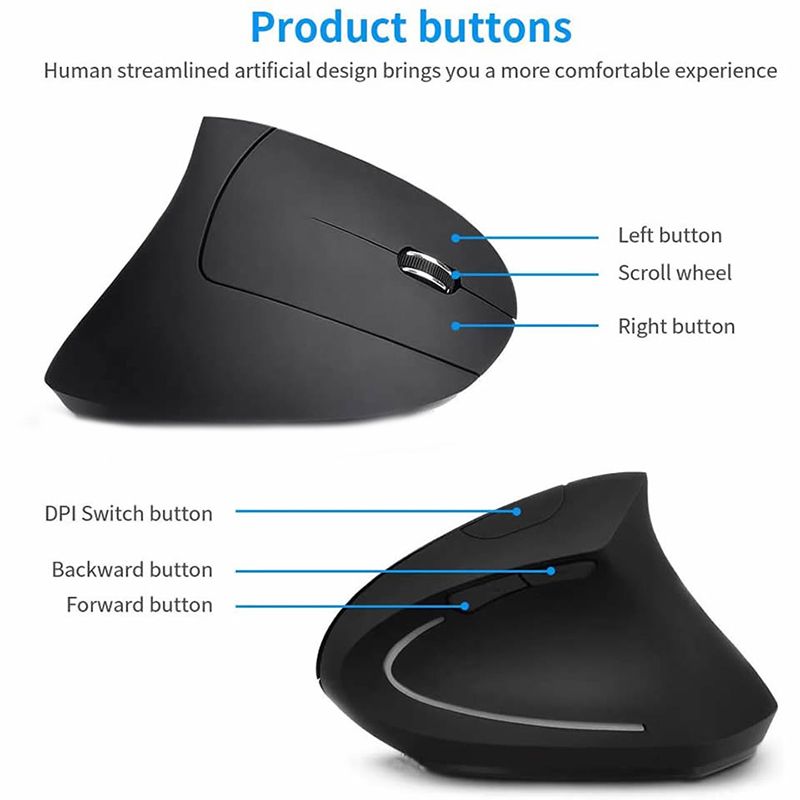 Features: 1. Ergonomic Vertical Mouse 2. Adjustable DPI: 800/1200/1600 DPI 3.2.4GHZ Bluetooth connection 4. Compatible with various systems 5.ABS material 6. Vertical grip, effectively protect the health of the wrist 7.10 meters transmission distance 8. Connect USB plug and play, no need to install any software, save time and worry 9. Battery powered Product List: 1 X mouse