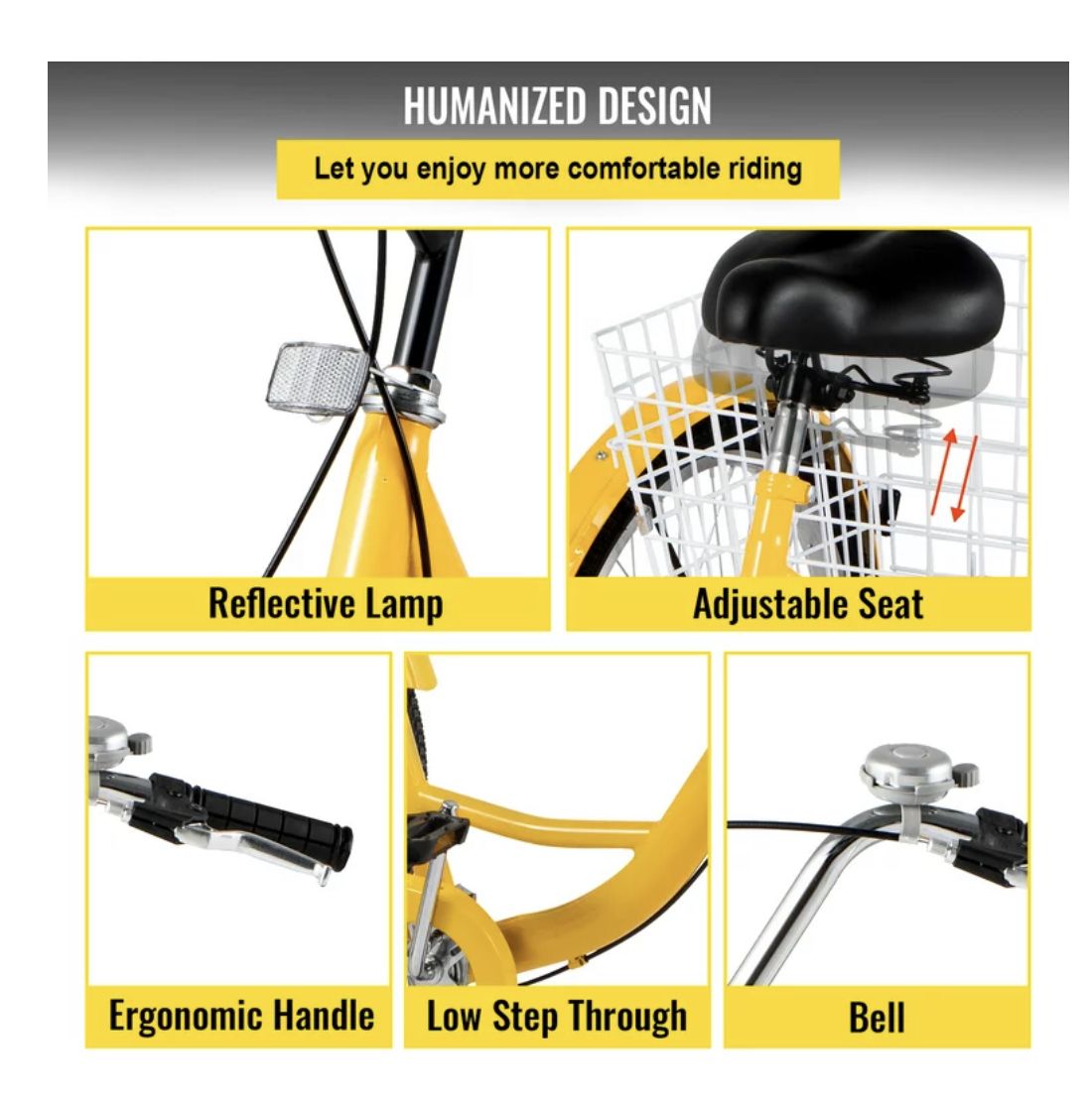 - Considerate Details:The tricycle bike for adults is equipped with reflective lights, warning bells, ergonomically designed handles, and easier steps, making it more suitable for driving on the road.