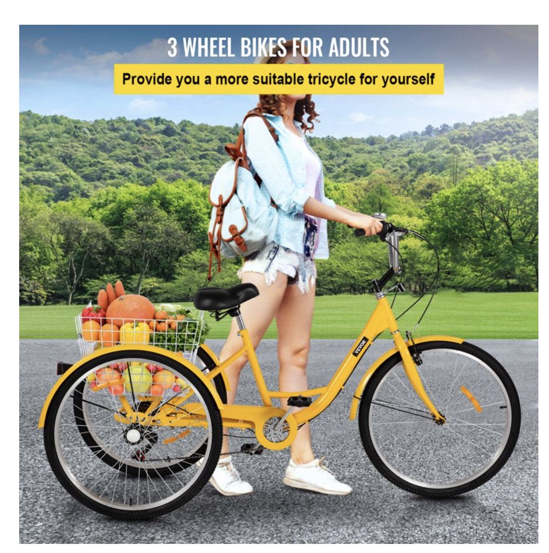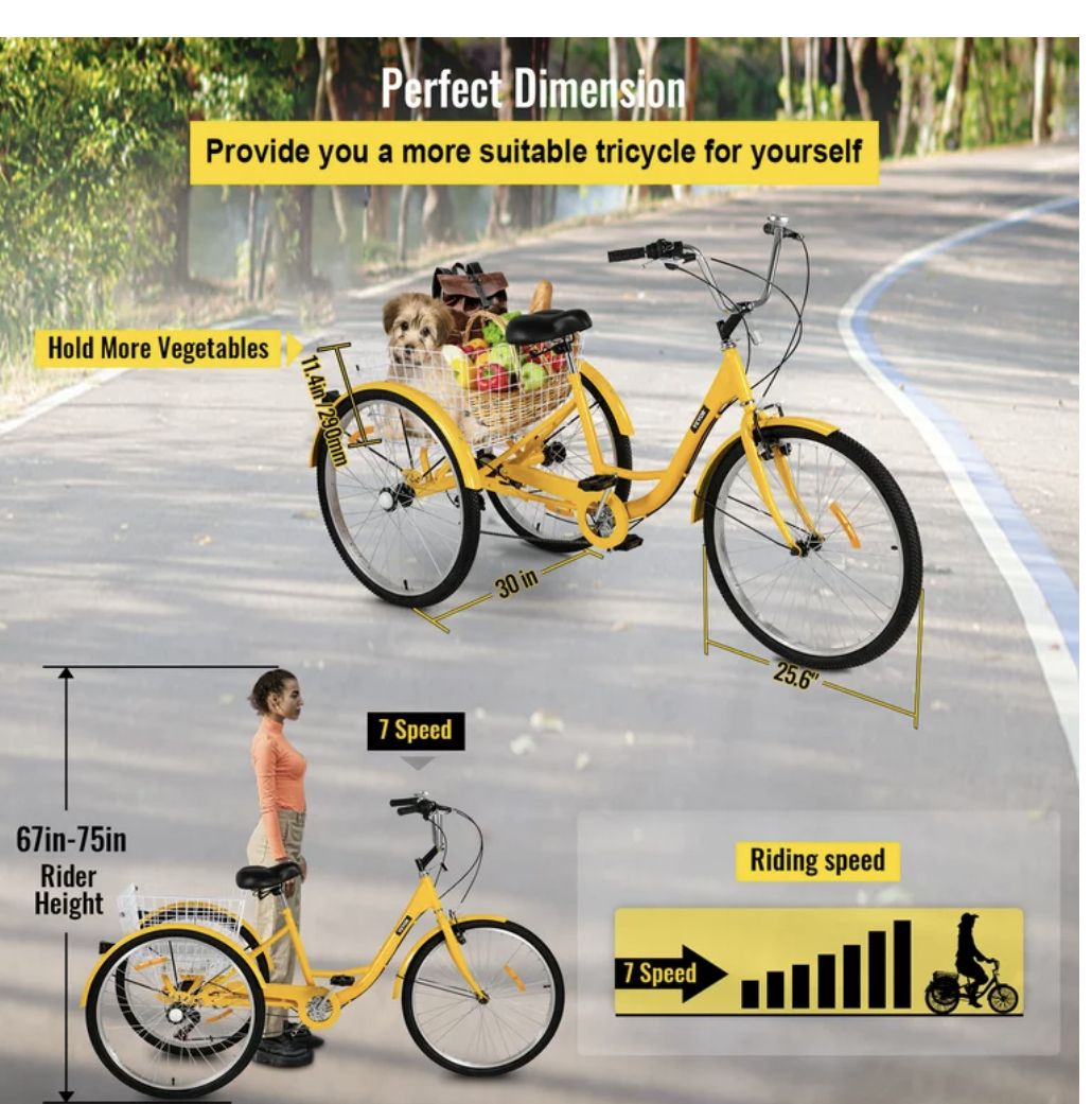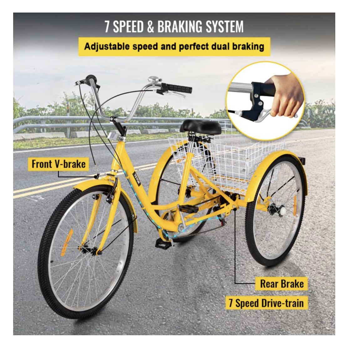 Adult Tricycle 3-Wheels Trike BicycleThis bicycle is designed to be durable with large load capacity for daily uses or working. Large soft saddle is equipped for better riding experience. 7-speed derailleur offers more fun in riding. 3-wheel frame is safe and stable on any road conditions for adults, especially elders. Simple and easy to use, reasonable price suitable for all classes. Hi-ten Steel FrameFrame made of Hi-tensile steel for high durability and stability, it is anti-rust, anti-corrosion and can support rider and cargo combined weight up to 150 kg (330 lbs). Seven Speed DrivetrainFlexible rear derailleur allows you to change speed freely and easily in case of any emergency. 7-speed wheel and shifter included also. You can rest assured use. Excellent Front V-brakeFront V brake and rear brake of this tricycle would provide double protection for you. Dual brakes promise the rider a smooth and intuitive stopping. Durable 26'' Wheels3 big 26'' wheels with full wrap fenders would keep the tricycle clean and neat even in rainy condition. Also, the 3-wheel design can provide you extra stability. Adjustable Padded SeatAn extra-Large padded seat with springs is designed to cushion your rid, offering you a better riding experience. Easy to adjust its height simply by turning the seat post clamp. Practical Large BasketNo longer need to worry about riding with many items. This bicycle with large rear basket can accommodate lots of vegetable, fruits, etc. Perfect for picnic, shopping, recreation and the like.
