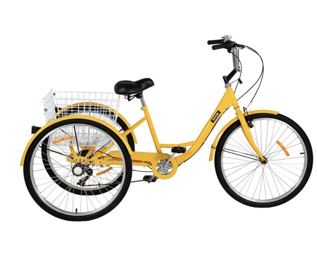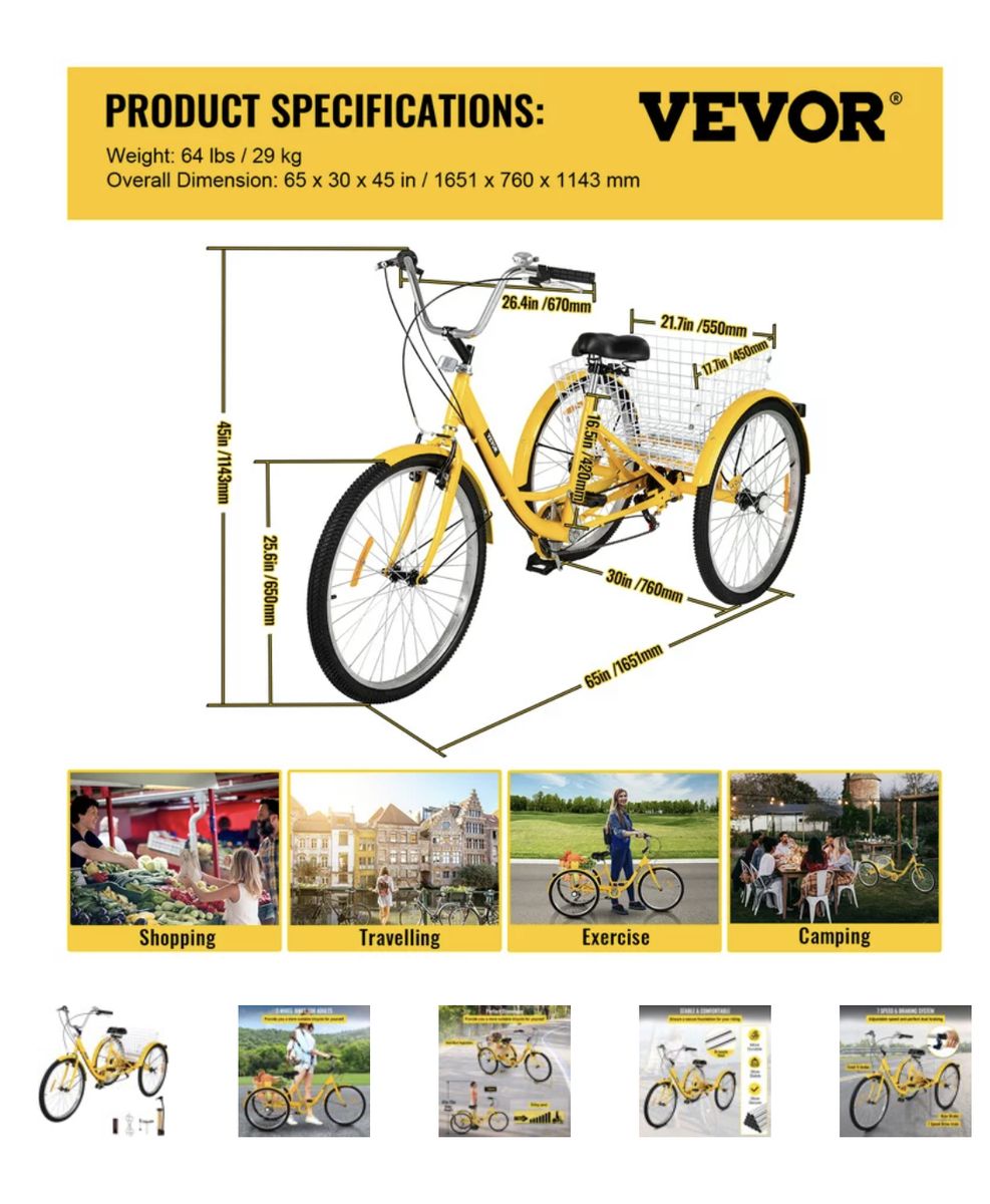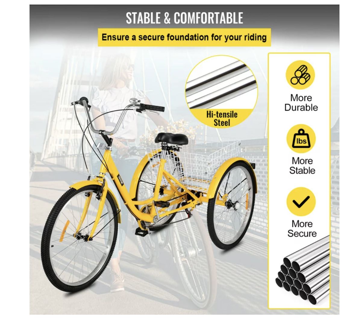 Adult Tricycle 3-Wheels Trike BicycleThis bicycle is designed to be durable with large load capacity for daily uses or working. Large soft saddle is equipped for better riding experience. 7-speed derailleur offers more fun in riding. 3-wheel frame is safe and stable on any road conditions for adults, especially elders. Simple and easy to use, reasonable price suitable for all classes. Hi-ten Steel FrameFrame made of Hi-tensile steel for high durability and stability, it is anti-rust, anti-corrosion and can support rider and cargo combined weight up to 150 kg (330 lbs). Seven Speed DrivetrainFlexible rear derailleur allows you to change speed freely and easily in case of any emergency. 7-speed wheel and shifter included also. You can rest assured use. Excellent Front V-brakeFront V brake and rear brake of this tricycle would provide double protection for you. Dual brakes promise the rider a smooth and intuitive stopping. Durable 26'' Wheels3 big 26'' wheels with full wrap fenders would keep the tricycle clean and neat even in rainy condition. Also, the 3-wheel design can provide you extra stability. Adjustable Padded SeatAn extra-Large padded seat with springs is designed to cushion your rid, offering you a better riding experience. Easy to adjust its height simply by turning the seat post clamp. Practical Large BasketNo longer need to worry about riding with many items. This bicycle with large rear basket can accommodate lots of vegetable, fruits, etc. Perfect for picnic, shopping, recreation and the like.
