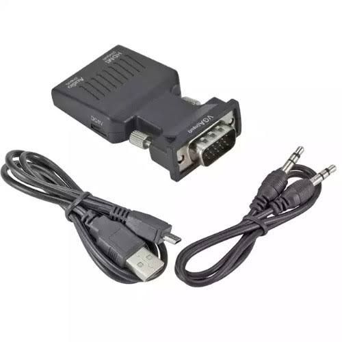 Converts HDMI digital signal to VGA analog signal; 3.5mm audio port sends audio to speakers or a display