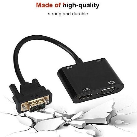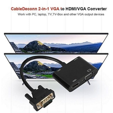 Features:CableDeconn 2-in-1 VGA to HDMI/VGA converter - Work with PC, laptop, TV,TV-Box and other VGA output devices.VGA to VGA + HDMI converter for stable and fast signal transmission.Made of high-quality, strong and durable.User-friendly design - Lightweight & Portable.Plug and play, easy to use.Specification:Type: VGA to HDMI/VGA ConverterModel: D0308: CableDeconnWeight: Approx. 83.7g