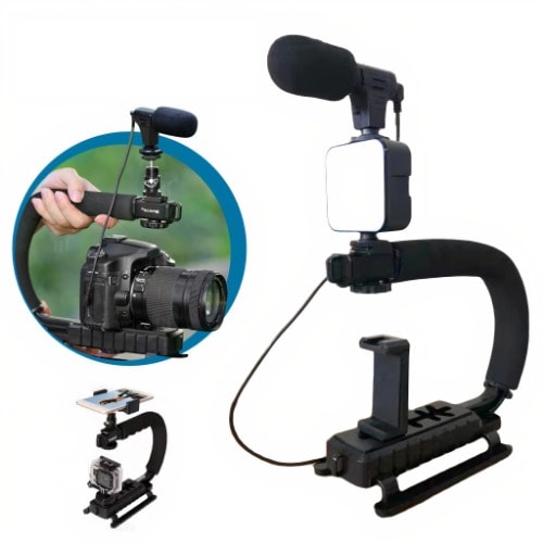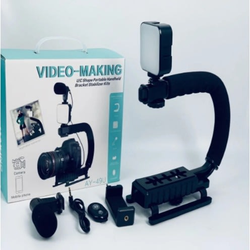 The GTI Model AY-49U Video Creation and Streaming Kit with Microphone for Camcorder is a stabilizer kit with a portable U/C-shaped handheld stand.