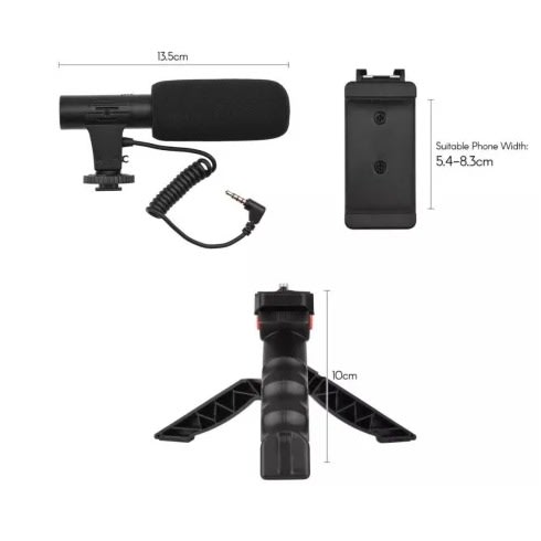 Vlogging kit for all kinds of phones and camera is a kit designed for smartphone camera video recording with 3.5mm TRRS plug microphone, universal for Vlog making, interview, live streaming, online makeup, video chatting and more.Features:Noise Reduction Microphone: The microphone features cardioid wide pickup range and powerful noise canceling technology, plus high quality mic for high quality recording.6500K LED Light: 49pcs lamp bead provides the light 6500K color temperature and 5W output , powered with 2pcs AA batteries(not included), for brighter and uniform video lighting.Universal Phone Clamp: The phone holder clamping range is about 5.4-8.3cm/2.13-3.27in, widely for mostly used smartphones. Top cold shoe mount enables quick microphone and LED light mounting.Dual Use Tripod Handle: Designed with foldable plate, the tripod is dual applicable for hand gripping and table settling, ergonomic designed shape makes gripping more comfortable.Wide Application: The kit is designed for smartphone video recording with 3.5mm TRRS plug microphone, universal for Vlog making, interview, live streaming, online makeup, video chatting and more.Specifications:Main Material: Plastic Specification item: value Certification: Handheld Microphone, Desktop, wired microphoneUse for video vlogging