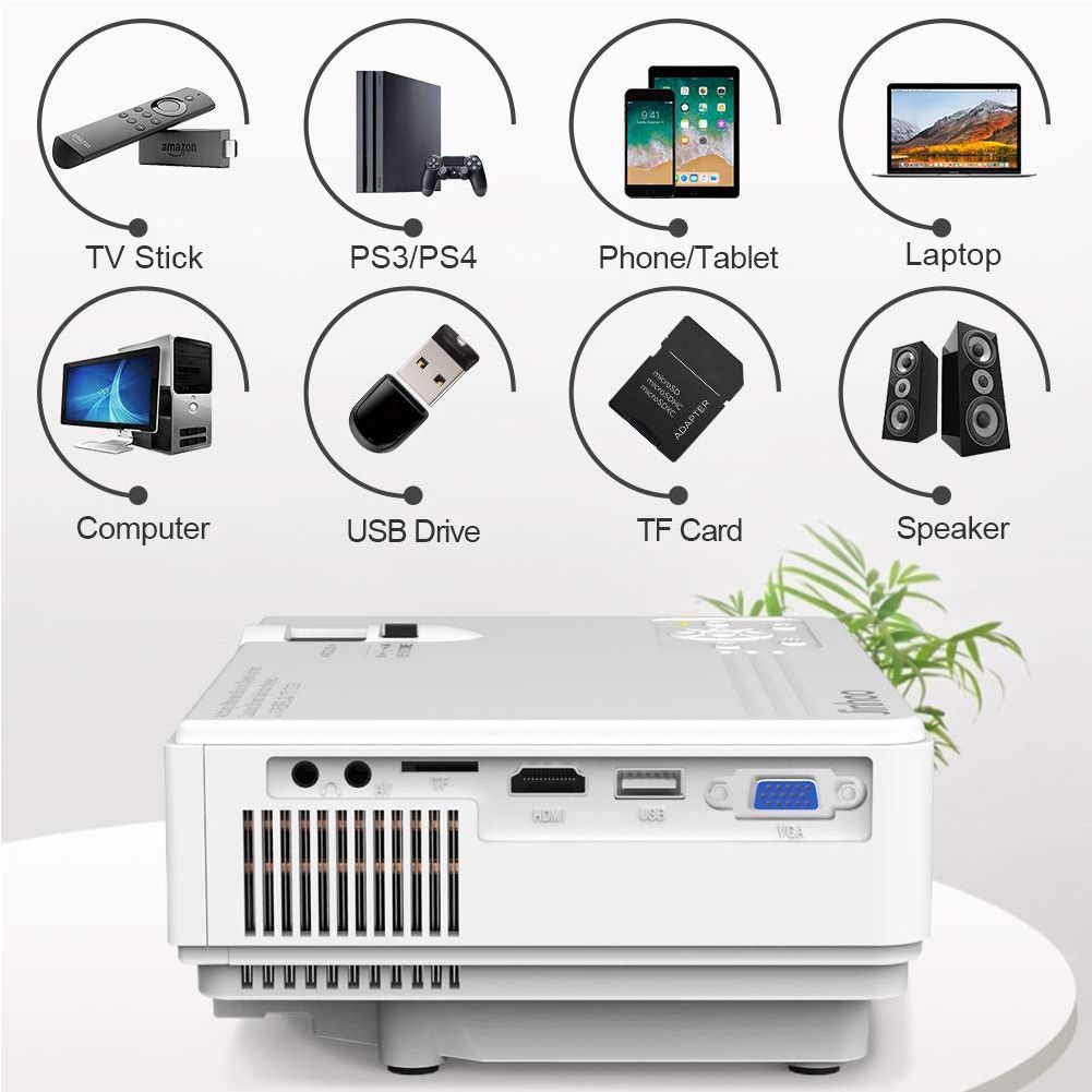 The projector is equipped with USB, TF card, HDMI, VGA and AV interface, which is widely compatible with Chromecast, PC, laptop, SD card, USB, etc. Perfect for enjoying movies, playing games, backyard BBQ nights, birthday parties and more.