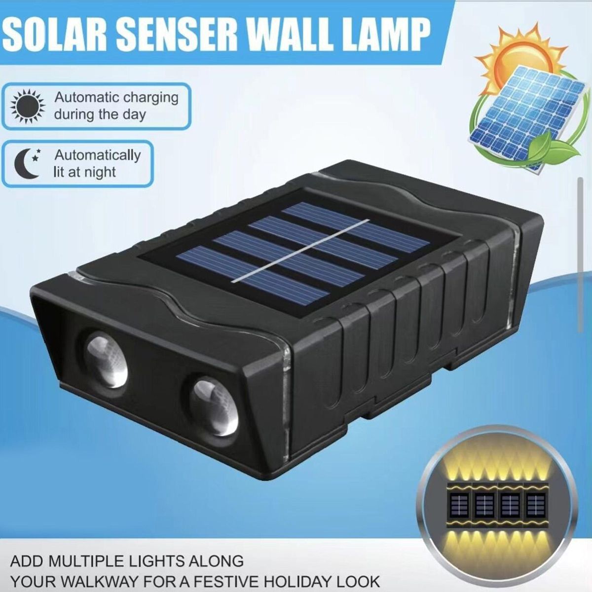 Illuminate your garden, patio, or front yard with this powerful and safe solar wall light. it's not only economical and environmentally friendly but also features a light-controlled sensor switch for added convenience. rainproof and lightning-proof, it provides continuous power supply even on rainy days.
