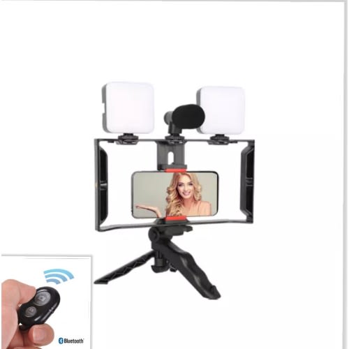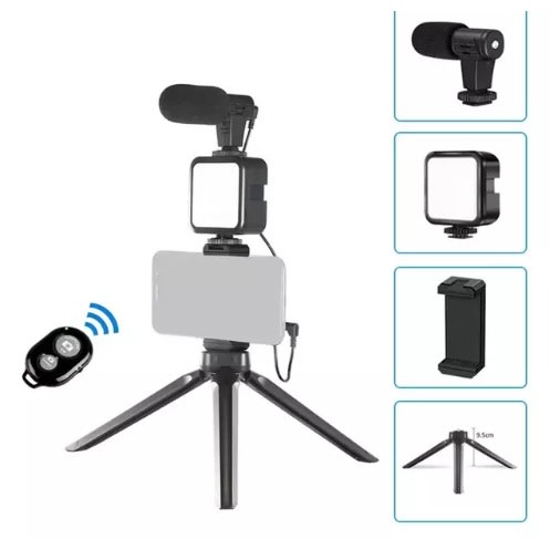 Phone Vlog Video Kit With Height Adjustable Tripod Phone Holder With Cold Shoe Mic Led Vid