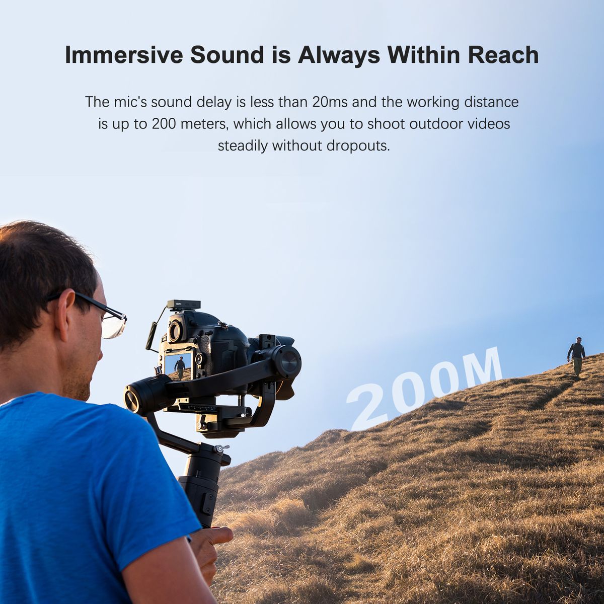 Long Transmission Distance: With a low audio latency of less than 20ms and a wireless transmission distance of up to 200m, this microphone ensures smooth and seamless audio recording, even from a distance.