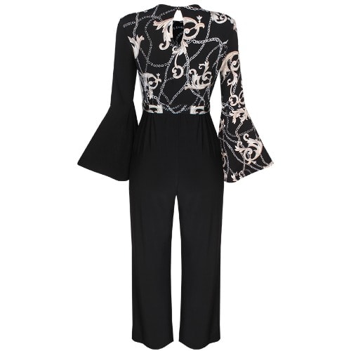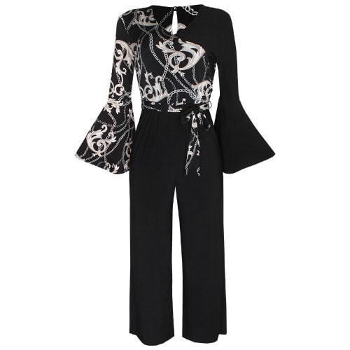 We're loving the glamourous vibe of this chic jumpsuit. The design features a flattering cross over front, a stylish vintage chain print at the top, flute sleeves, self-tie belt, and a plain wide leg trouser. Team with heels and a designer clutch for a night out.