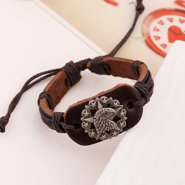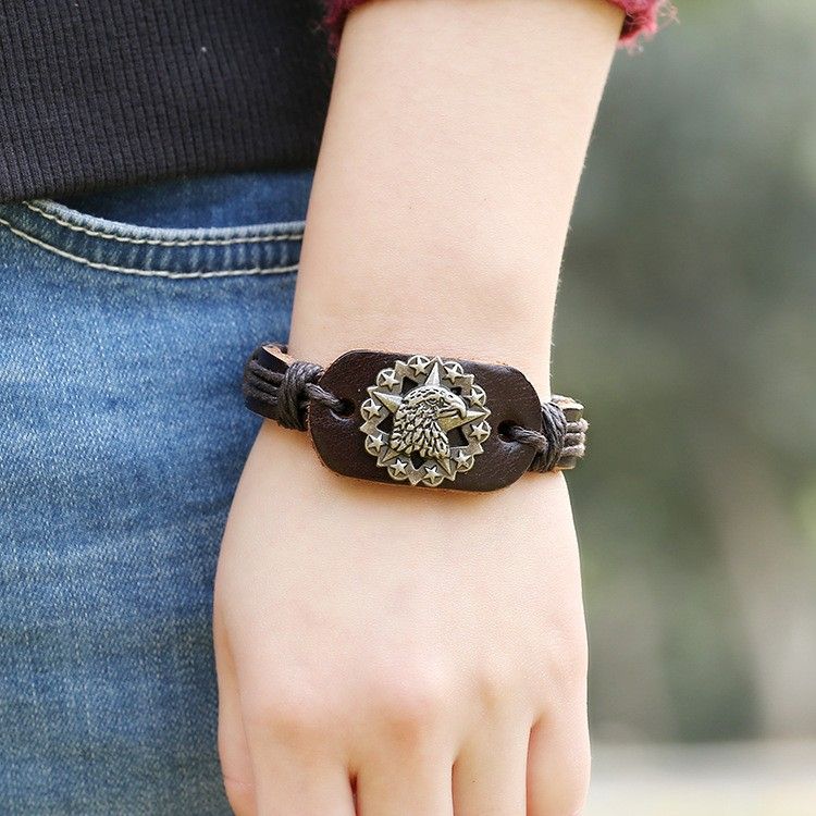 Type: Vintage Hand Woven Eagle Head BraceletLength: Chain circumference 22CM Cross: 3.5CM (approx.)Gender: Men/Womenstyle:fashionMaterial: alloy + cowhideOccasion: Club, Party, Christmas, Gift, Dating, etc.Features: Retro hand-woven eagle head bracelet, Christmas gift, good luster, simple but fashionable. Perfectly paired with your sweaters, t-shirts, cardigans for a cool and glamorous look.Sophisticated and thoughtful gift for a friend or family member of your faith for a birthday, anniversary, or everyday surprise. European and American style hand bracelets, hand-woven bracelets, retro bracelets. Healthy material, lead-free and non-toxic: leather accessories maintain their own color for life at room temperature. Its characteristics are completely non-corrosive, resistant to strong acids and alkalis, non-allergic, non-deformable, hard and bright. It is a green high-grade environmental protection accessory, which will not cause any side effects and harm to the human body.
