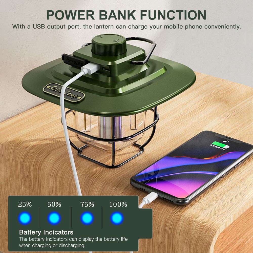 With built-in 2000mAh battery, the lantern is rechargeab-le via the type C input port, and can also charge your mobile phone via the USB output port.