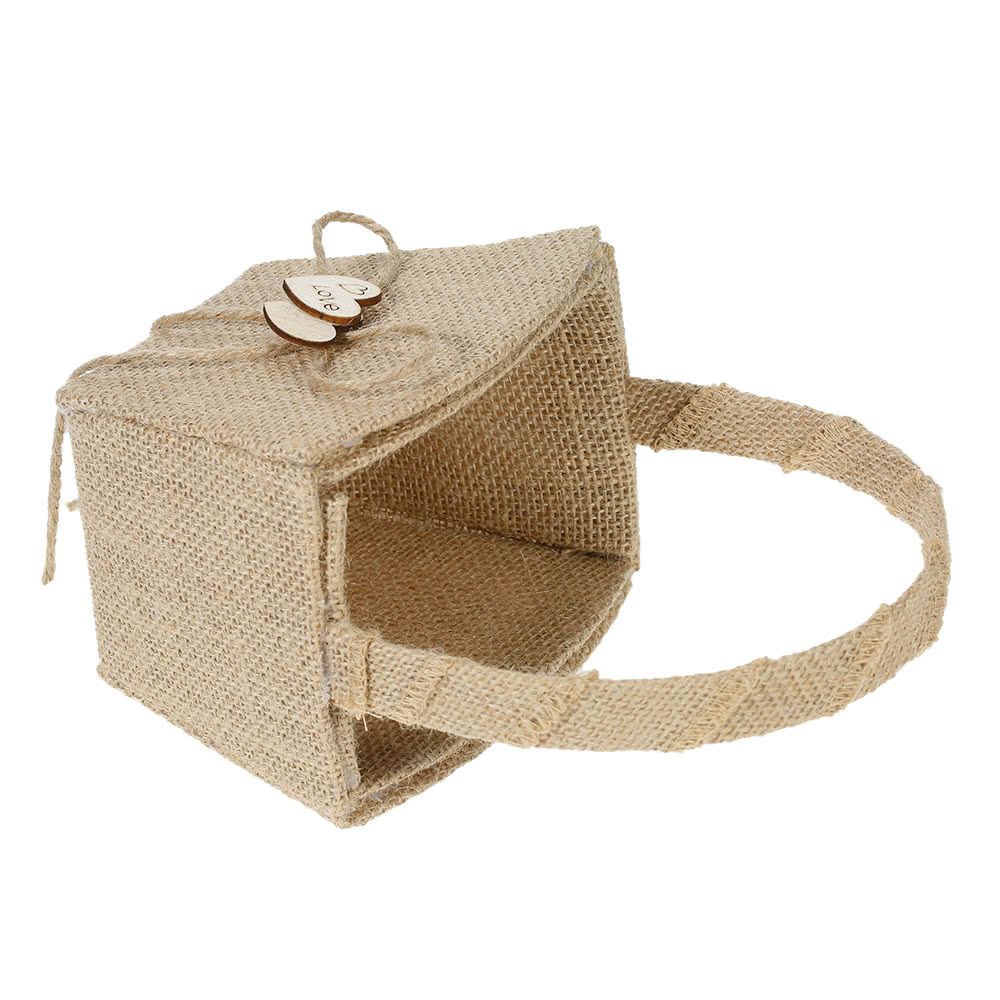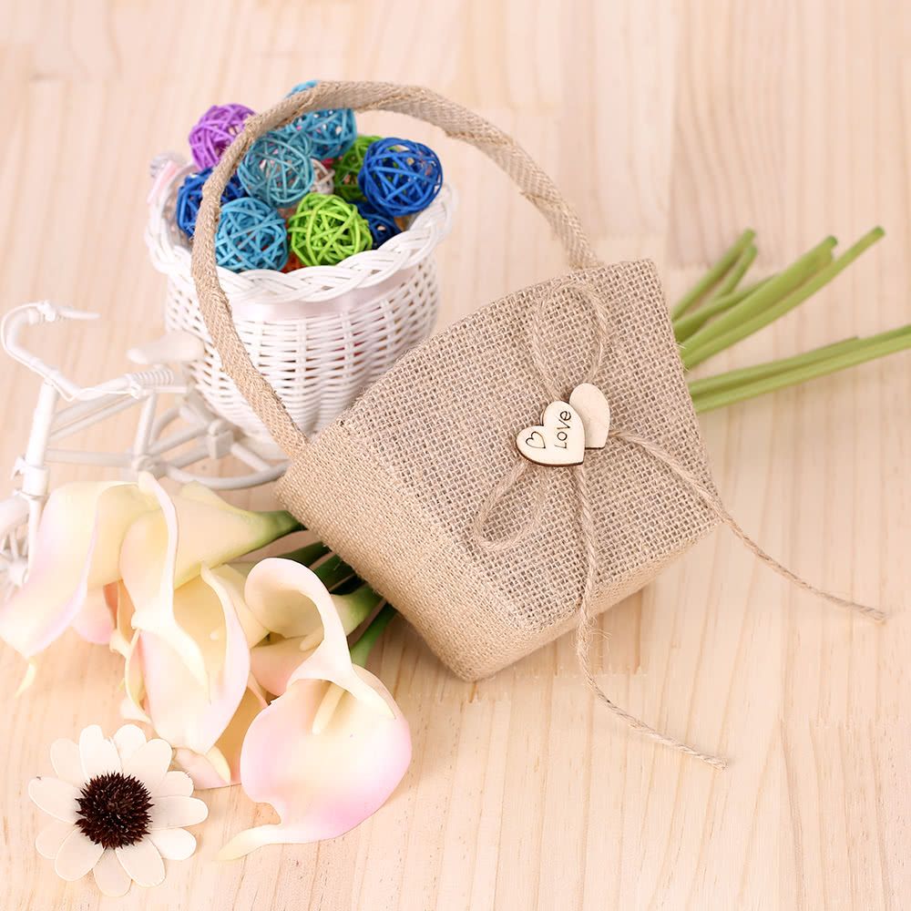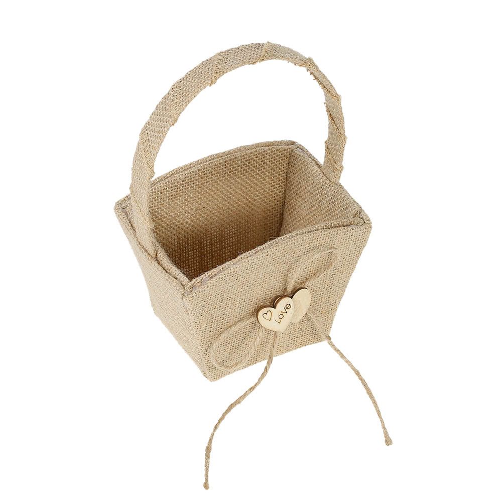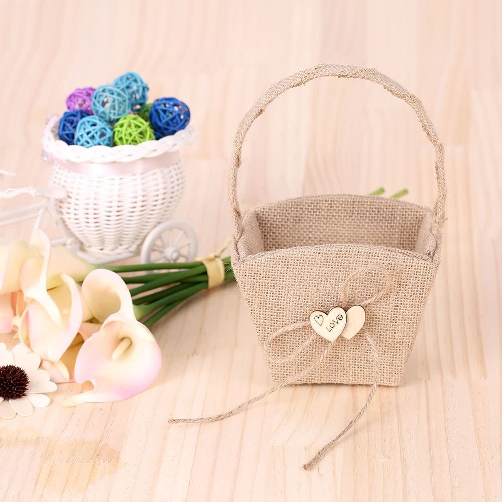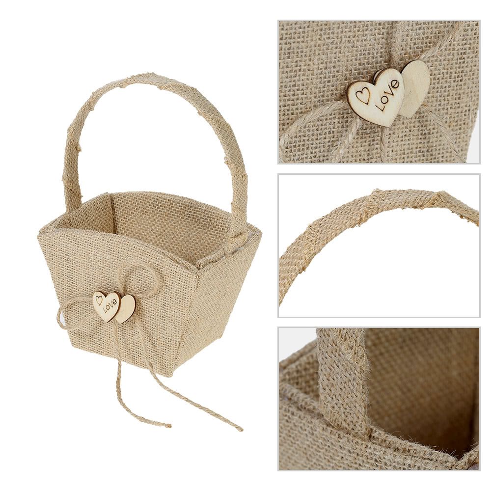 Burlap style flower basket, decorated with double wooden hearts and hemp rope bowknot, is exactly suitable for rustic themed wedding!