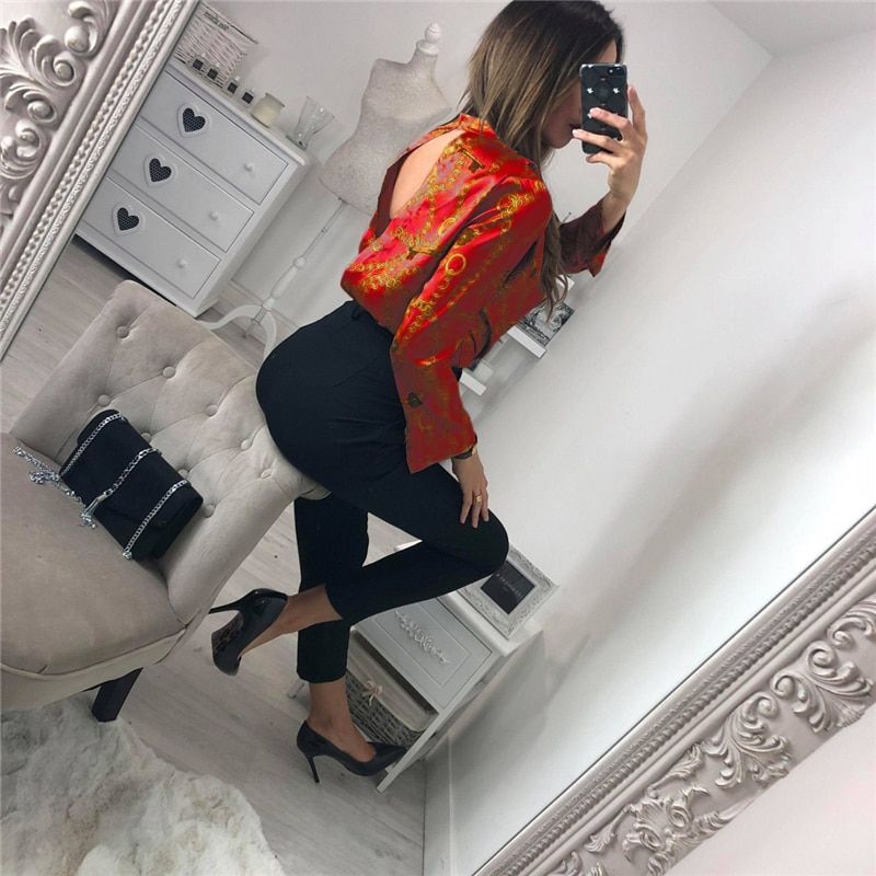 1X Vintage Silk Rompers Womens Jumpsuit Long Sleeve Chain Print Top Shirt Ladies Deep V Neck Key Printed Sexy Satin Bodysuits