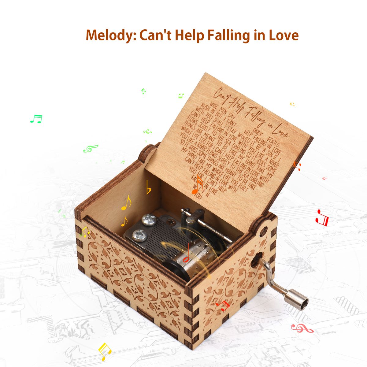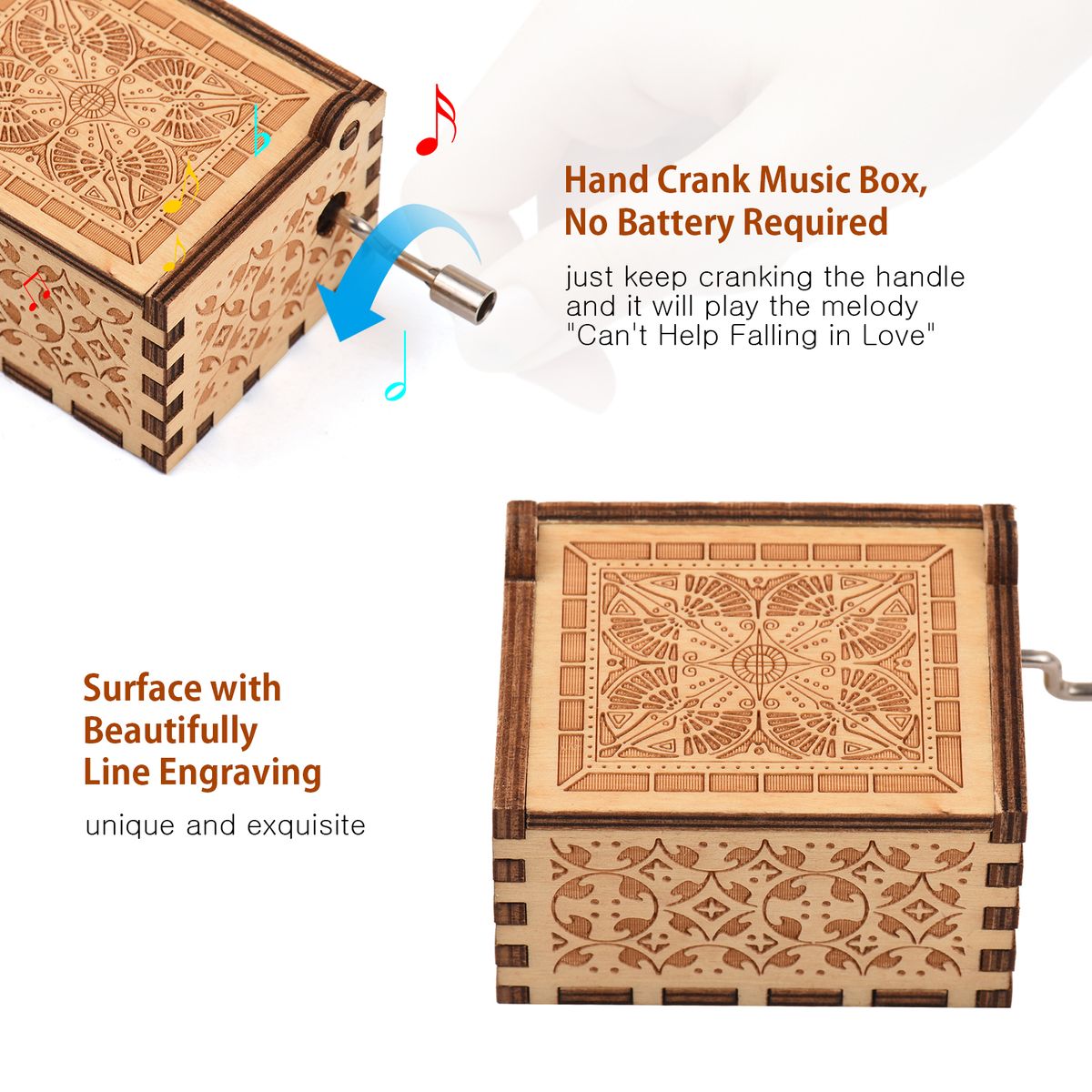 Features:Hand crank music box, no battery required, just keep cranking the handle and it will play the melody "Can't Help Falling in Love".