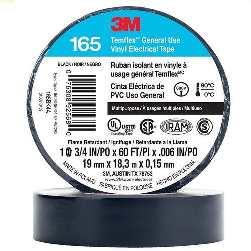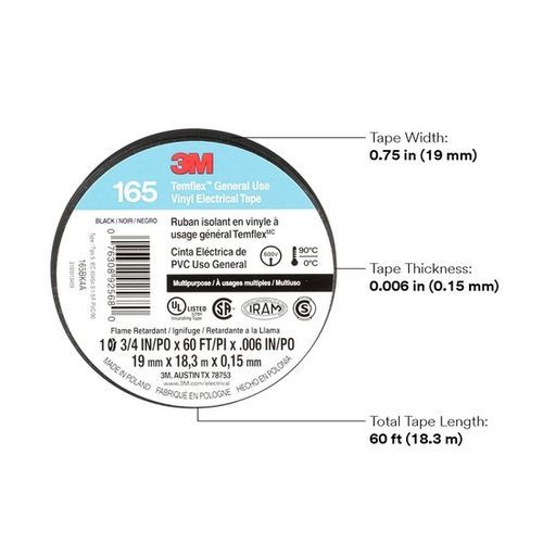 3M™ Temflex™ Vinyl Electrical Tape 165 is good quality, multi-purpose vinyl insulating tape. It has great resistance to moisture and varying weather conditions. It is a polyvinyl chloride (PVC) tape that is flame-retardant and conformable. 3M Temflex 165 Tape provides great mechanical protection with minimum bulk. It is a UL Listed and CSA Certified “Insulating Tape.”