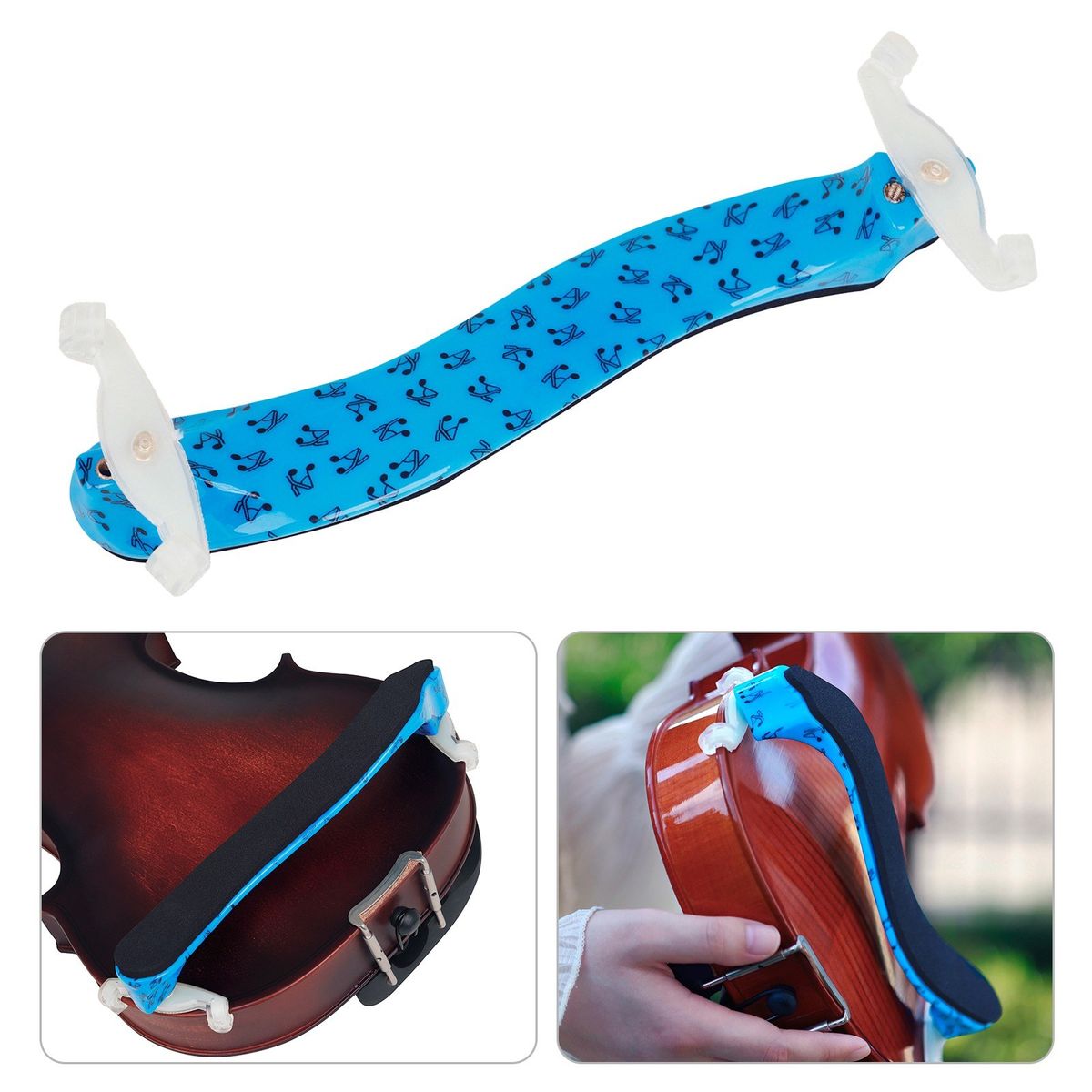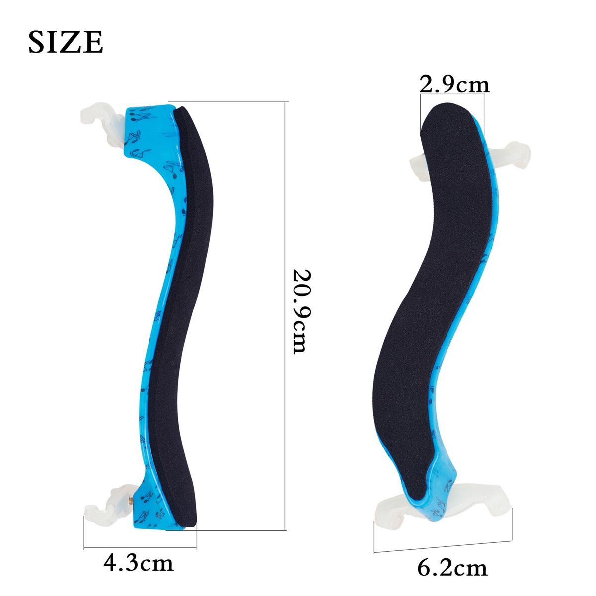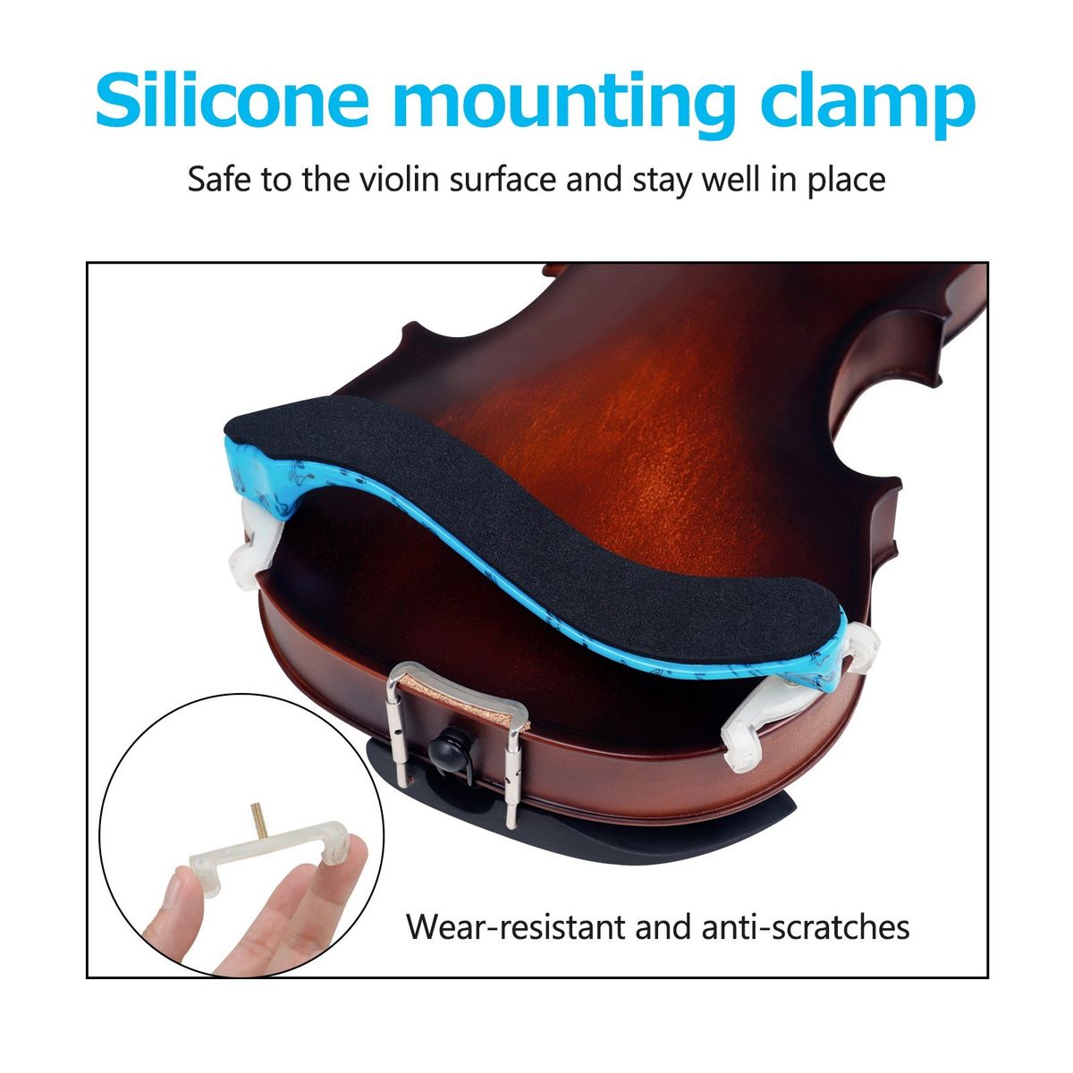 Specially designed silicone clamp allows room to adjust the height and width of the shoulder pad based on the violin size.