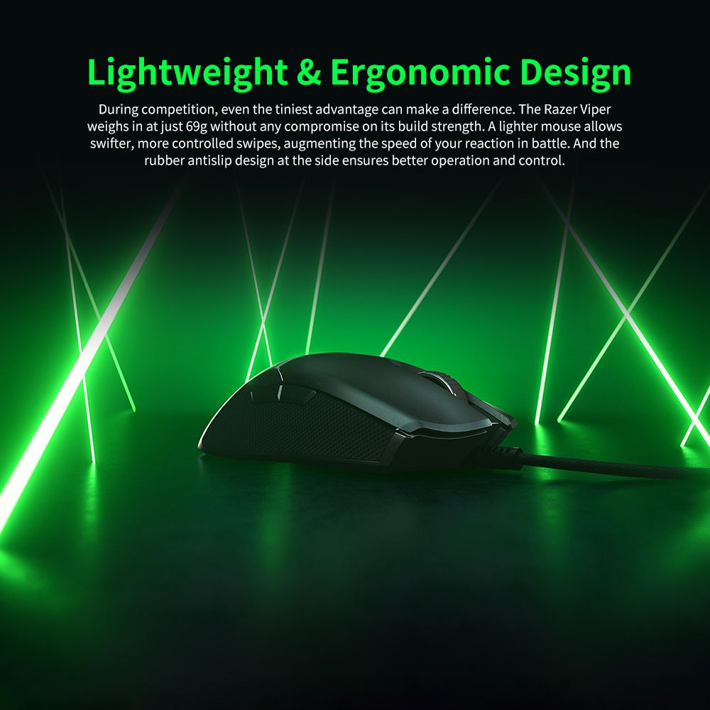 The Razer Viper is designed with reliable performance and high responsiveness and weighs in at just 69g without any compromise on its build strength, which is a gaming mouse that combines high precision, a cutting-edge lightweight body to allow to control the outcome of any battle.