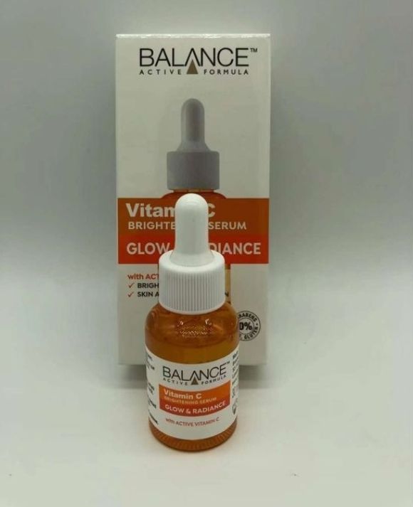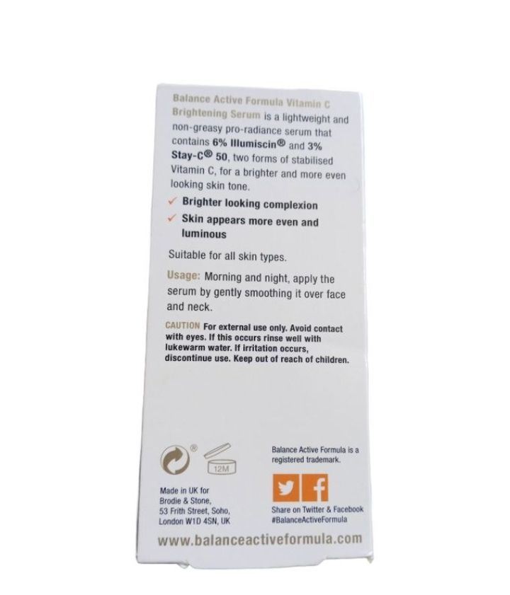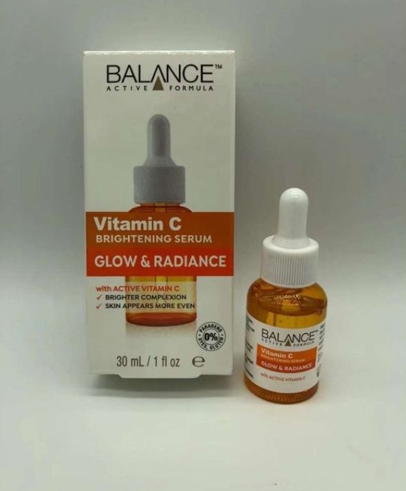 Vitamin C Brightening Serum is a lightweight and non-greasy pro-radiance serum. It contains 6% Illumiscin and 3% Stay-C® 50, two forms of stabilised Vitamin C, to help reduce the appearance of age spots, for a brighter and more even-looking skin tone. Illuminate and brighten the appearance of tired-looking skin.Balance Active Formula Vitamin C Brightening Serum (30ml) - With Active Vitamin C Creating a Brighter Complexion and Skin Appears More EvenContains 6% Illumiscin and 3% Stay-C 50, two forms of stabilised Vitamin CBrighter and more even-looking skin toneReduces the appearance of age spotsIlluminate and brighten the appearance of tired-looking dull skinCruelty FreeSuitable for all skin types. Dermatologically tested.