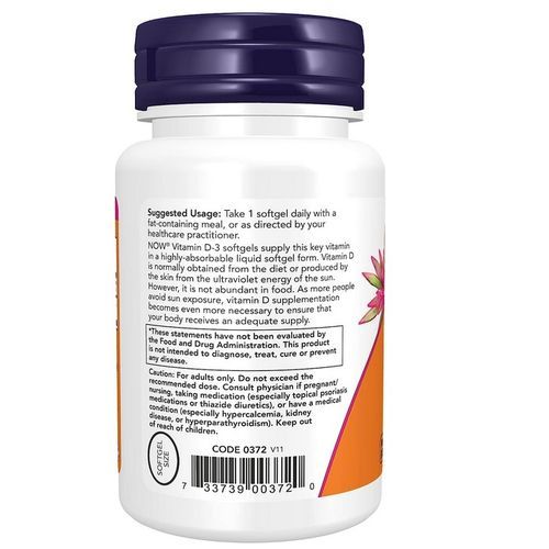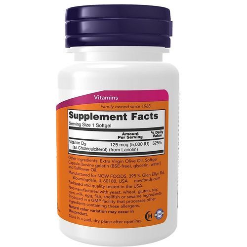 NOW® Supplements Vitamin D-3 5000 IU softgels supply this key vitamin in a highly-absorbable liquid softgel form. Vitamin D is normally obtained from the diet or produced by the skin from the ultraviolet energy of the sun. However, it is not abundant in food. As more people avoid sun exposure, vitamin D supplementation becomes even more necessary to ensure that your body receives an adequate supply. Natural color variation may occur in this product.